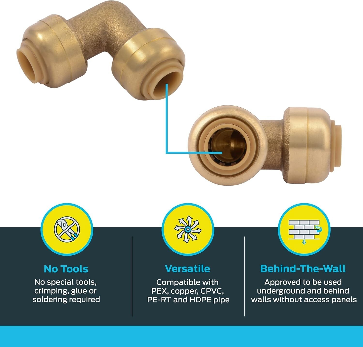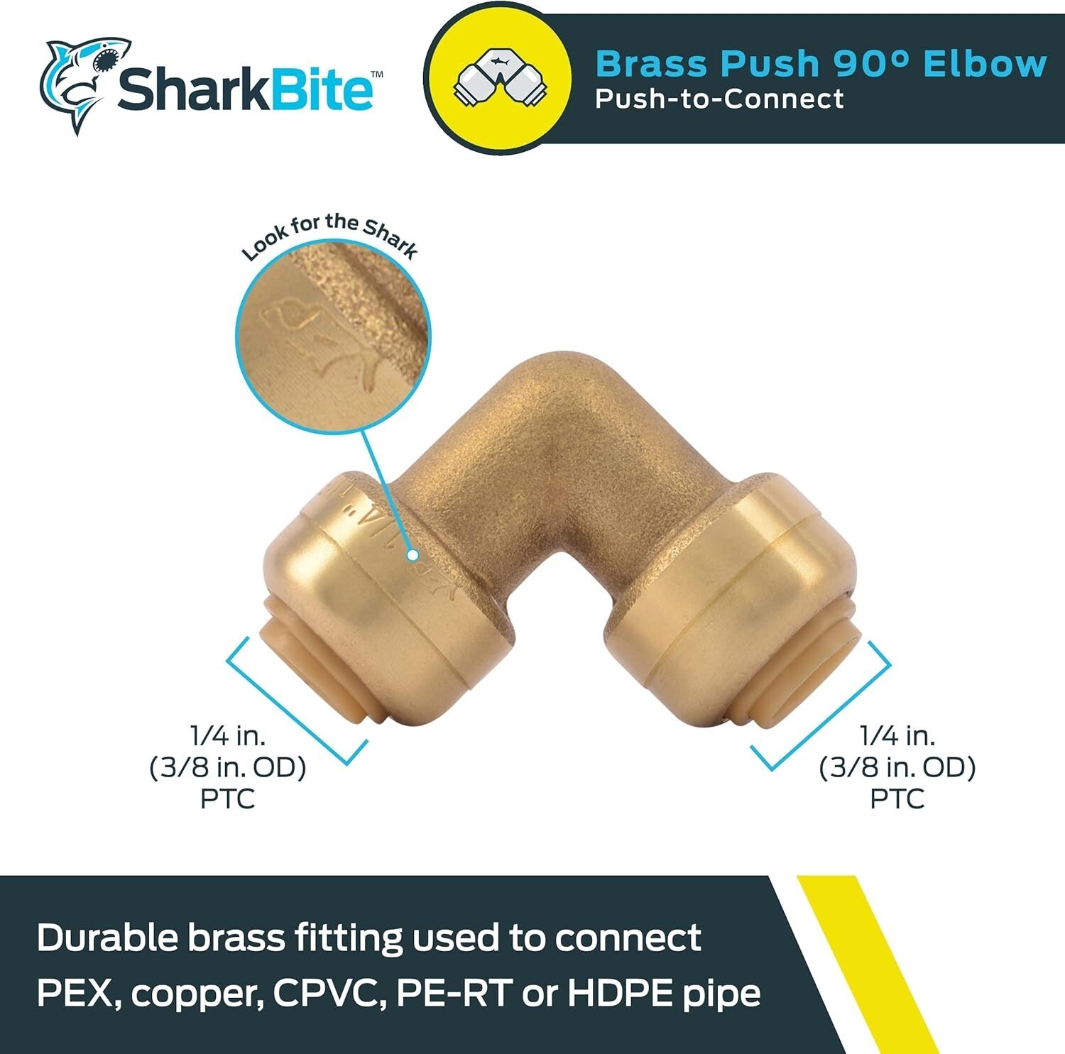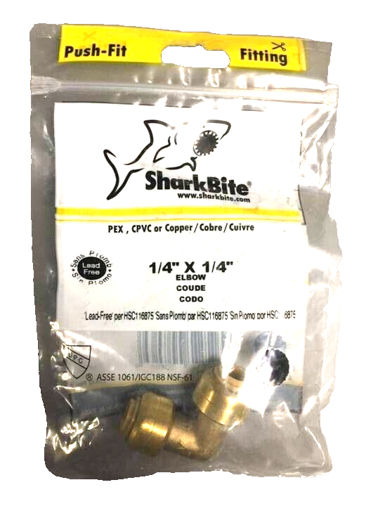 SharkBite elbows allow the user to connect any combination of copper, PEX CPVC or PE-RT pipe together to form a 90 deg connection. With no soldering, clamps, unions or glue required, it's as simple as inserting the pipe into the fitting deep enough to be sealed by our specially formulated O-ring. Once inserted, the stainless steel teeth bite down and grip the pipe. This push-to-connect fitting is designed for potable water and radiant heating (including underground or behind the wall) applications with no access panels required. It is rated up to 200 deg F and 200 psi.