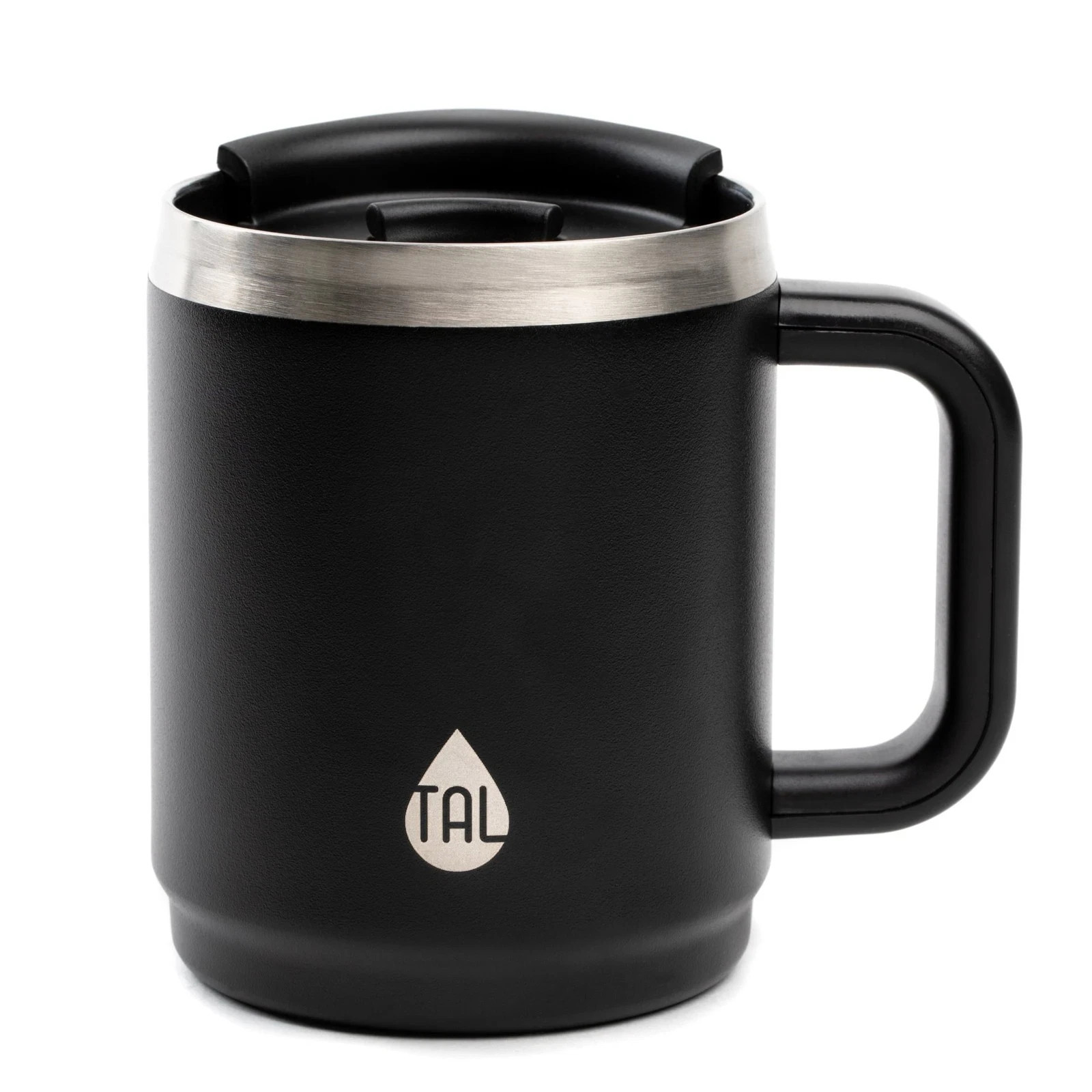TAL Stainless Steel Boulder Coffee Mug 14oz, Black is great for coffee and tea drinkers when you prefer a mug with a handle. The Brew includes a sliding splash proof lid which is perfect for transport or carrying while on-the-go! The Brew's double wall insulation is dual purpose, allowing your favorite hot beverage to stay warm for hours or keeping your iced coffee or tea cold. The Brew fits under your coffee maker and the easy carry handle allows you to quickly grab and go. For care and use, please wash in warm water with dish soap and a soft sponge
