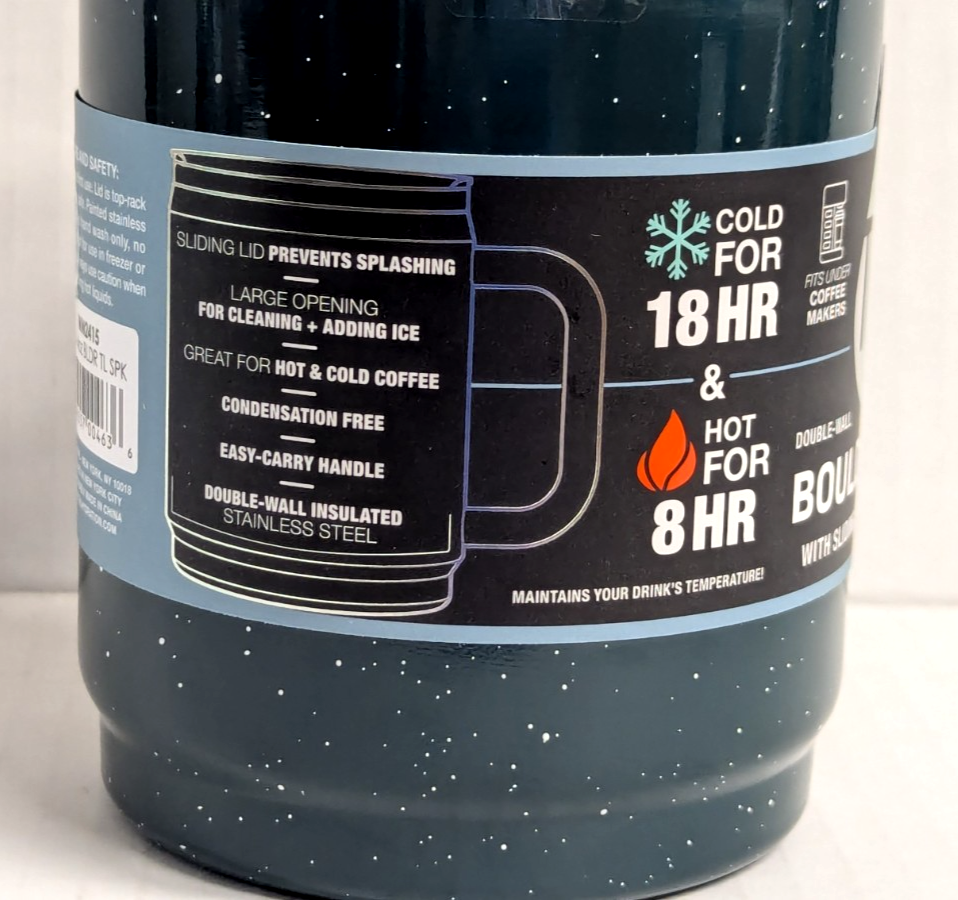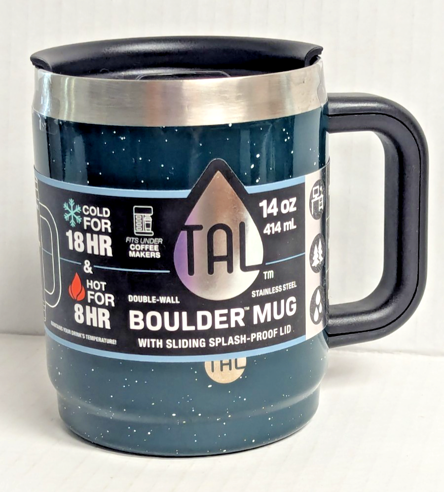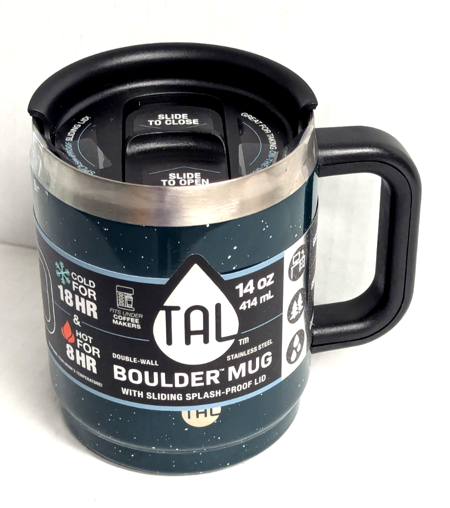 TAL Stainless Steel Boulder Coffee Mug 14oz, Teal Speckle is great for coffee and tea drinkers when you prefer a mug with a handle. The Brew includes a sliding splash proof lid which is perfect for transport or carrying while on-the-go! The Brew's double wall insulation is dual purpose, allowing your favorite hot beverage to stay warm for hours or keeping your iced coffee or tea cold. The Brew fits under your coffee maker and the easy carry handle allows you to quickly grab and go. For care and use, please wash in warm water with dish soap and a soft sponge