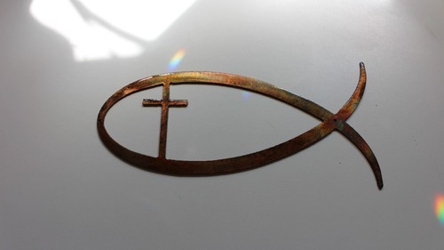 Metal Wall Art Decor Christian Fish Symbol with Cross 24" Copper/Bronze Plated
