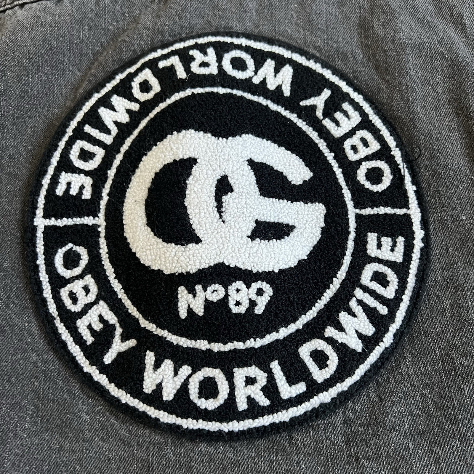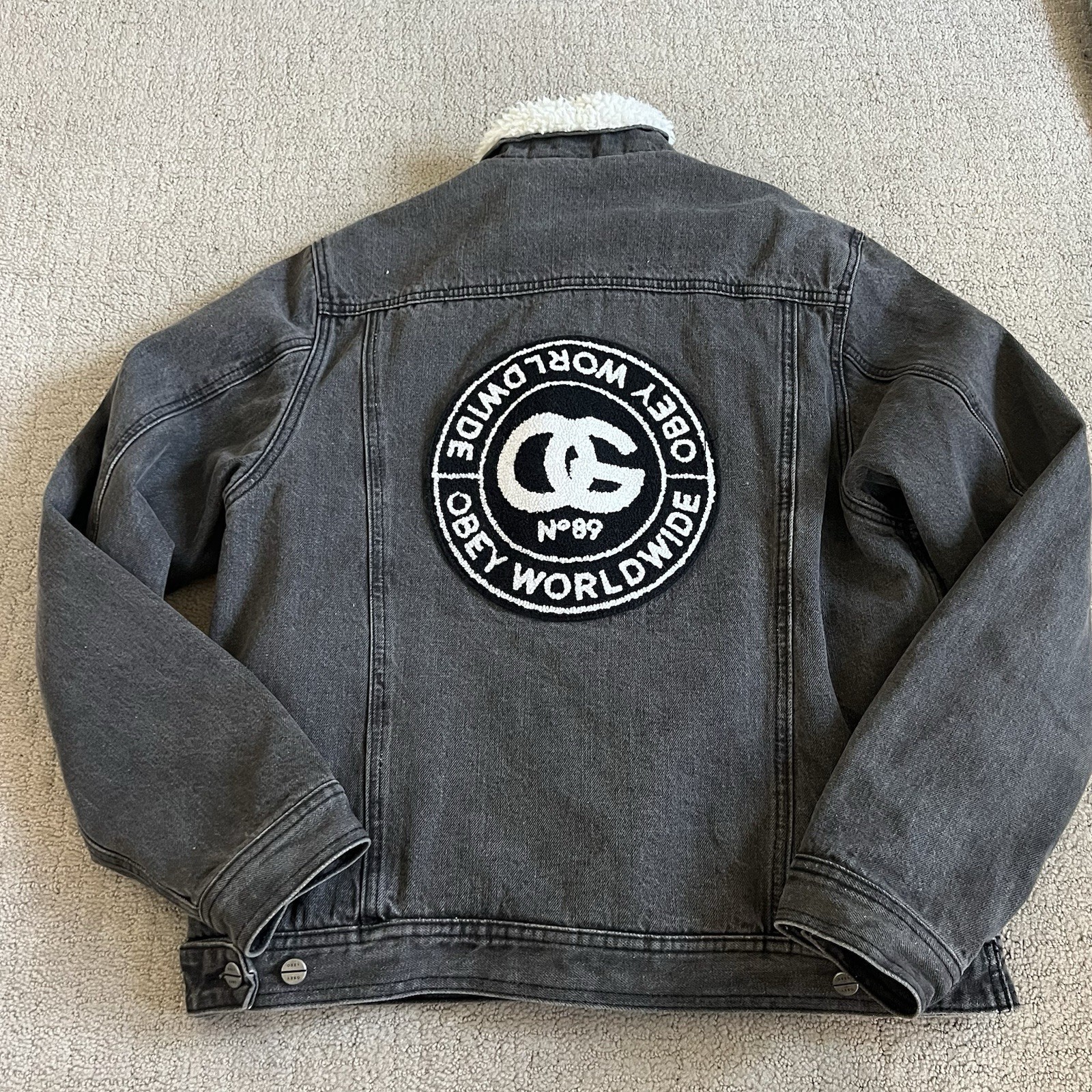 Obey Women’s Sherpa Trucker Jean Jacket Sz S Black Denim Back Patch Faux Fur GUC