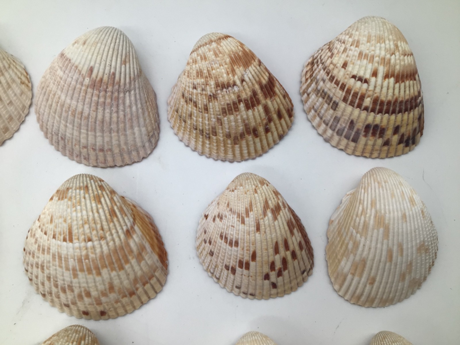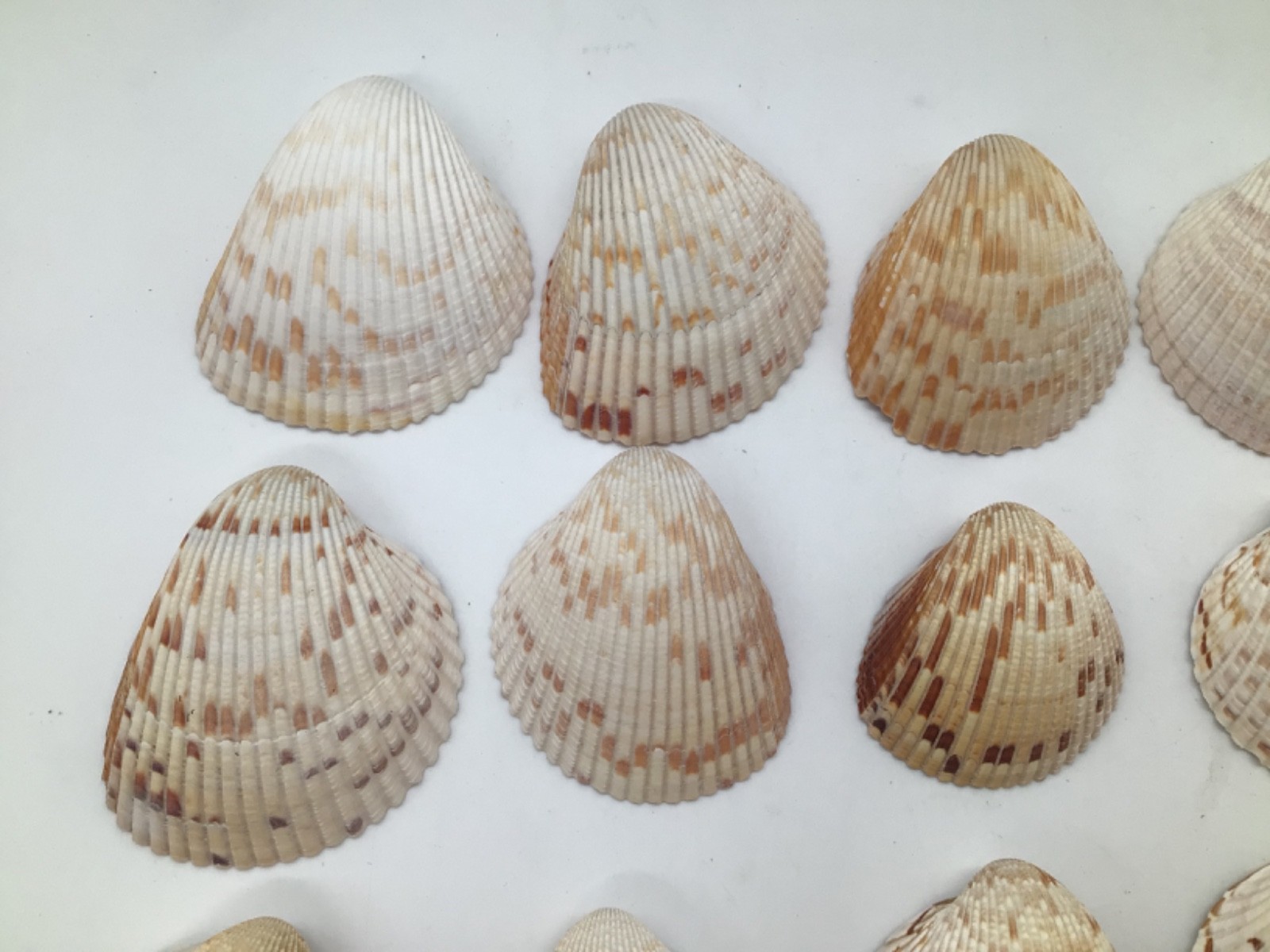 This lot of 27 natural cockle seashells was hand-collected from the Florida shore, making them an authentic coastal find. With ribbed texture and warm cream-to-brown tones, these shells are ideal for nautical home accents, craft projects, or unique specimen display.