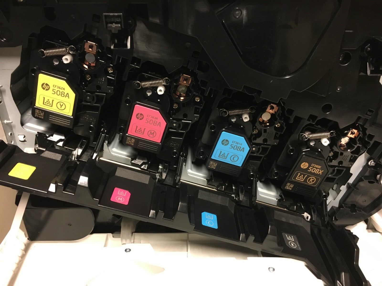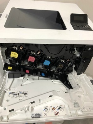 This printer comes very lightly used, in excellent, working condition! It was removed working from an office. It comes with a set of four working, partially used toners! (see test print for levels)