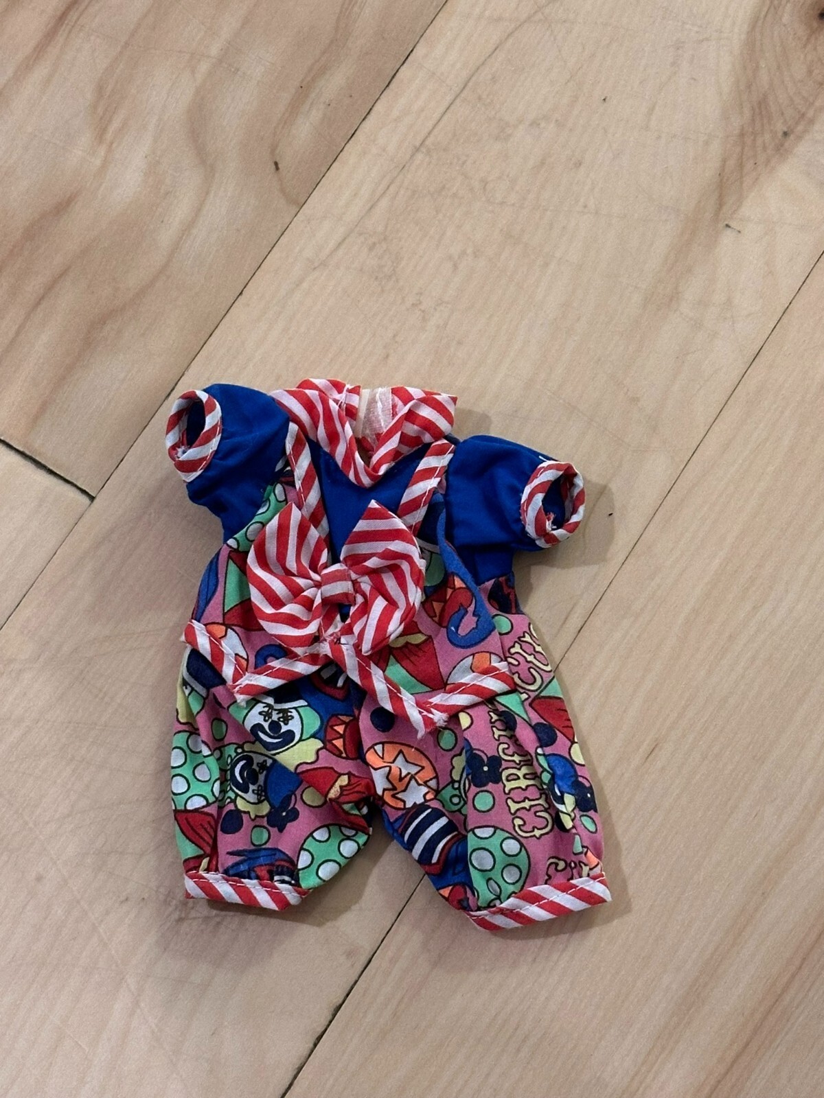 Bring fun and nostalgia to your doll collection with this colorful vintage clown costume outfit. Features a bright circus print with red-and-white striped bow tie and trim. Perfect for doll collectors, display, or play.