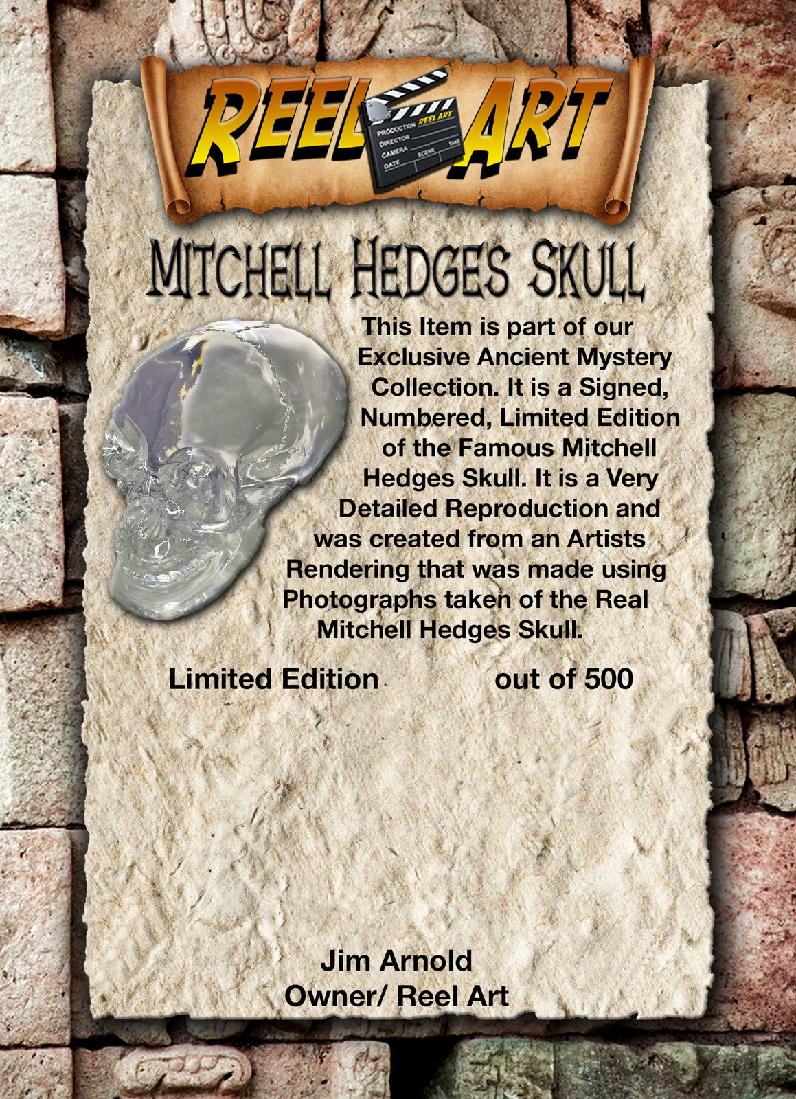 This Mitchell Hedges Skull is part of our Ancient Mystery Collection. It is an Exclusive, Signed, Numbered, Limited Edition Replica of the Famous Original Mitchell Hedges Skull with a Jaw that Opens and Closes. This Skull is an Exact Reproduction and was created from an Artists Rendering made from Photographs of the Real Artifact. Each item comes complete with a Full Color, Professionally Printed, Certification Card. This Card Explains the full history of the Mitchell Hedges Skull.