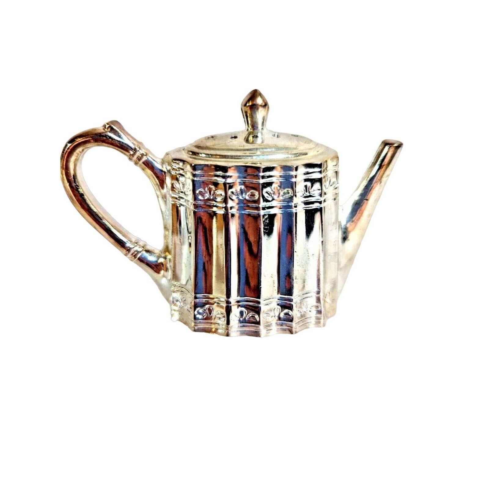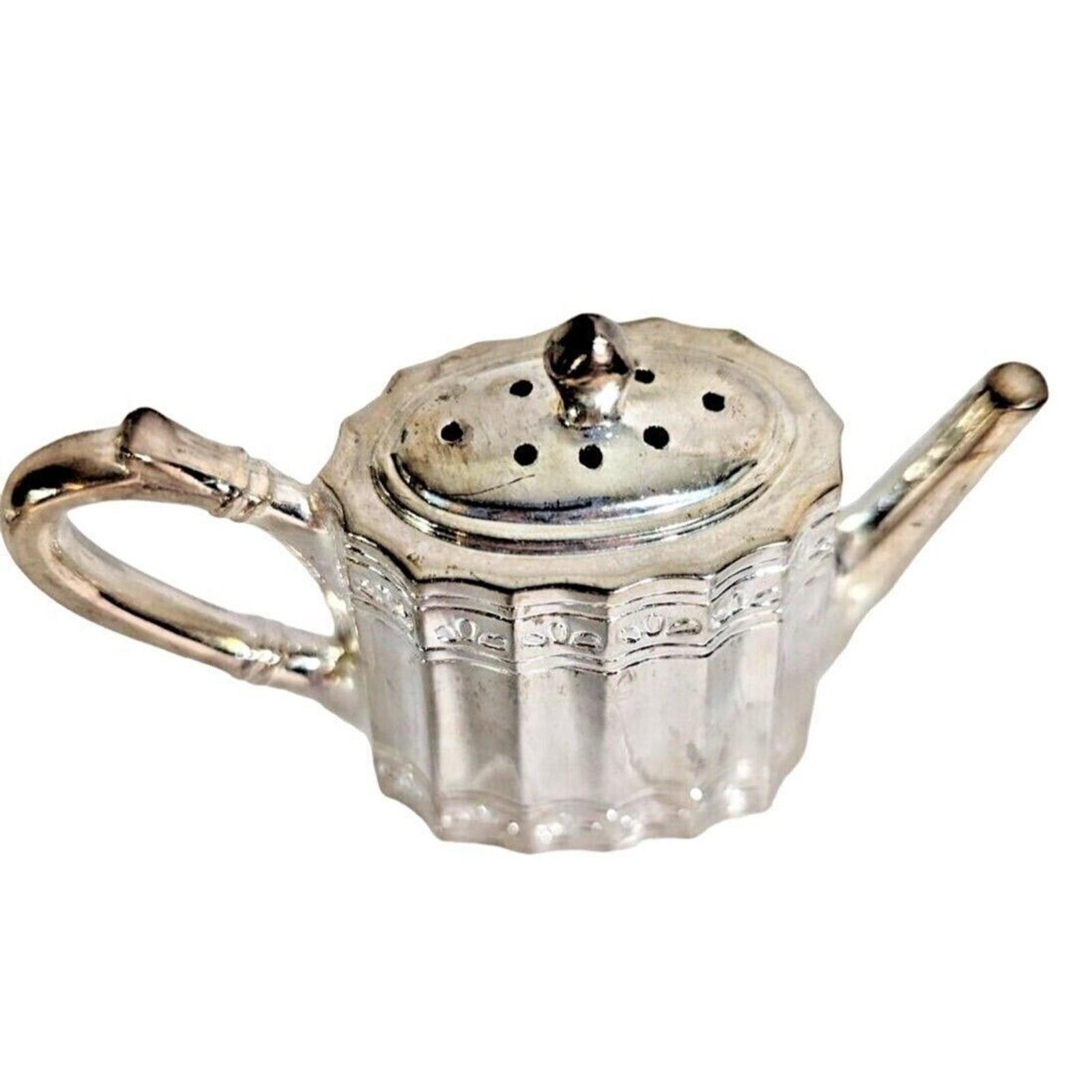 Made of silver-plated material with an intricate embossed design, this Victorian-style salt shaker features a teapot shape, adding a touch of elegance to all occasions.