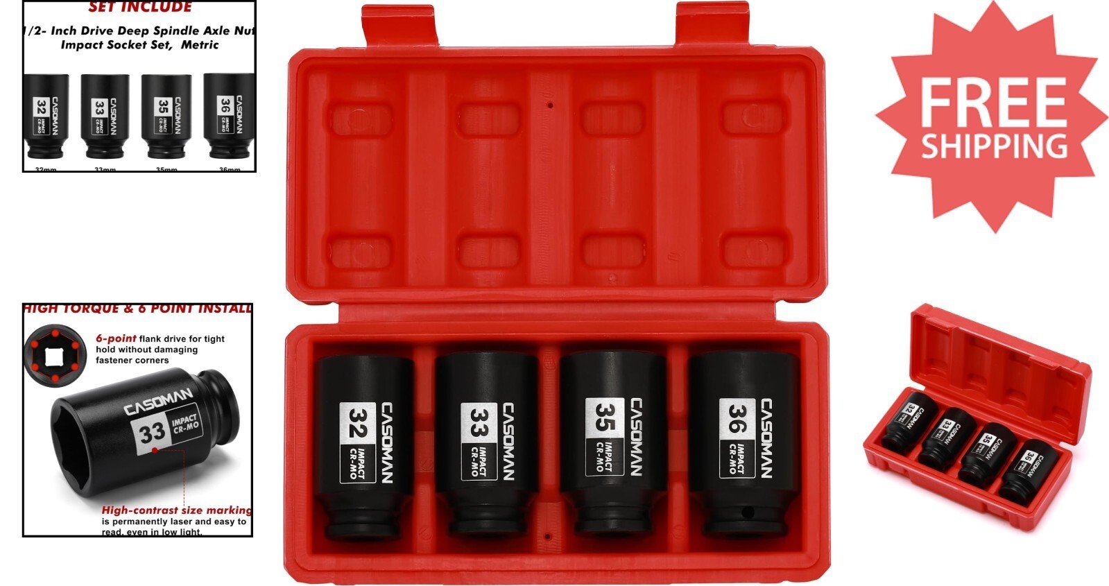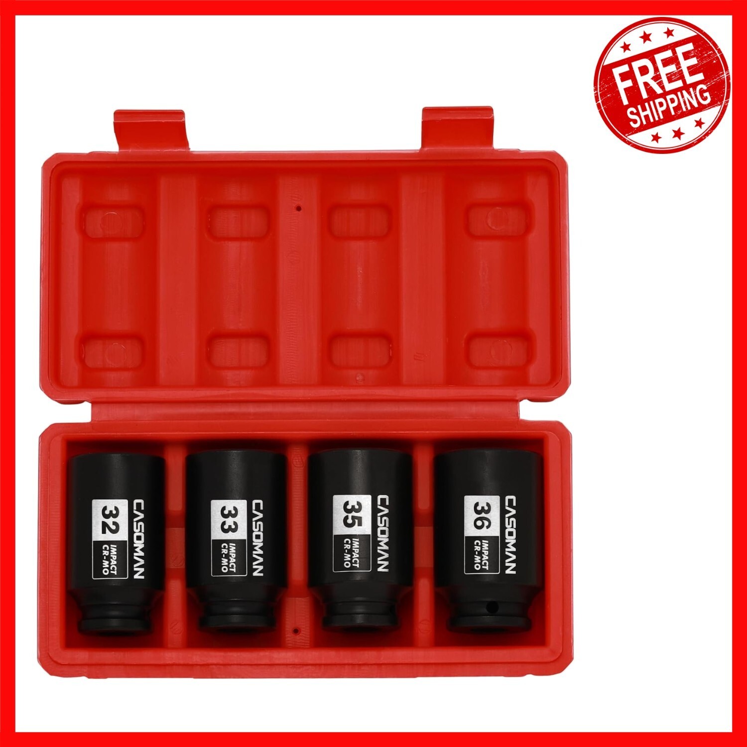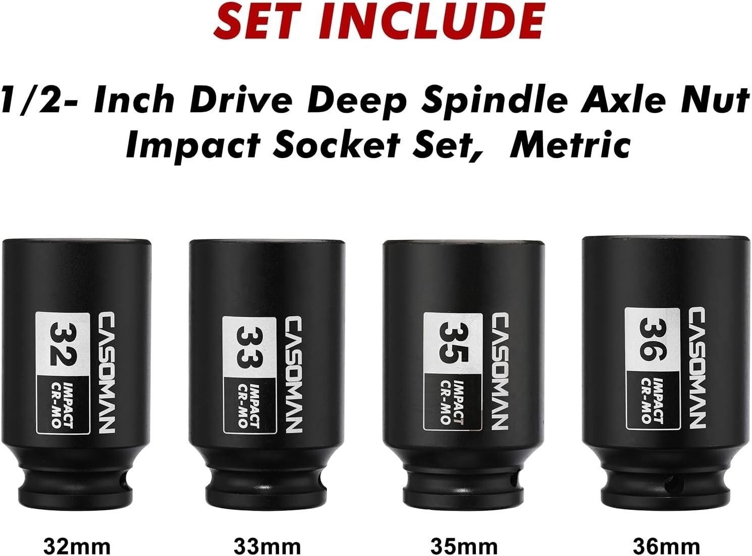 Upgrade your tool collection with this durable 4-Piece Metric Impact Socket Set, featuring 6-point deep impact sockets in 32, 33, 35, and 36mm sizes. Made from drop forged, heat-treated heavy-duty chrome molybdenum steel with a corrosion-resistant black phosphate finish, these sockets are designed for maximum strength and longevity. The high-contrast laser-etched size markings ensure easy identification, even in low-light conditions. The set includes a sturdy blow-molded storage case for convenient transport and organization. Suitable for removing, installing, and repairing hub or axle nuts on most American and imported vehicles, and meeting or exceeding ANSI standards. Backed by a 1- quality . To ensure fast and reliable delivery, we work with multiple fulfillment partners and suppliers. Depending on availability and location, your order may ship from different warehouses or arrive in packaging that varies from item to item. Tracking details are typically provided shortly after shipment, and customer satisfaction remains our top priority. Please note that due to carrier policies and regional regulations, certain items may not be eligible for delivery to specific states or territories.