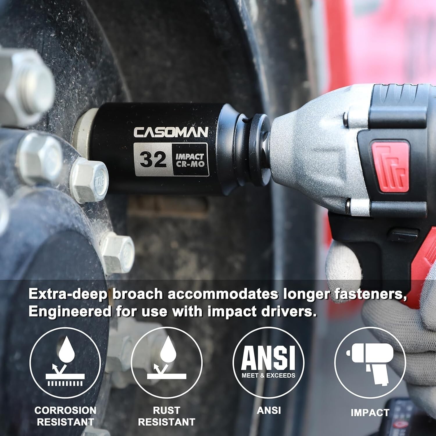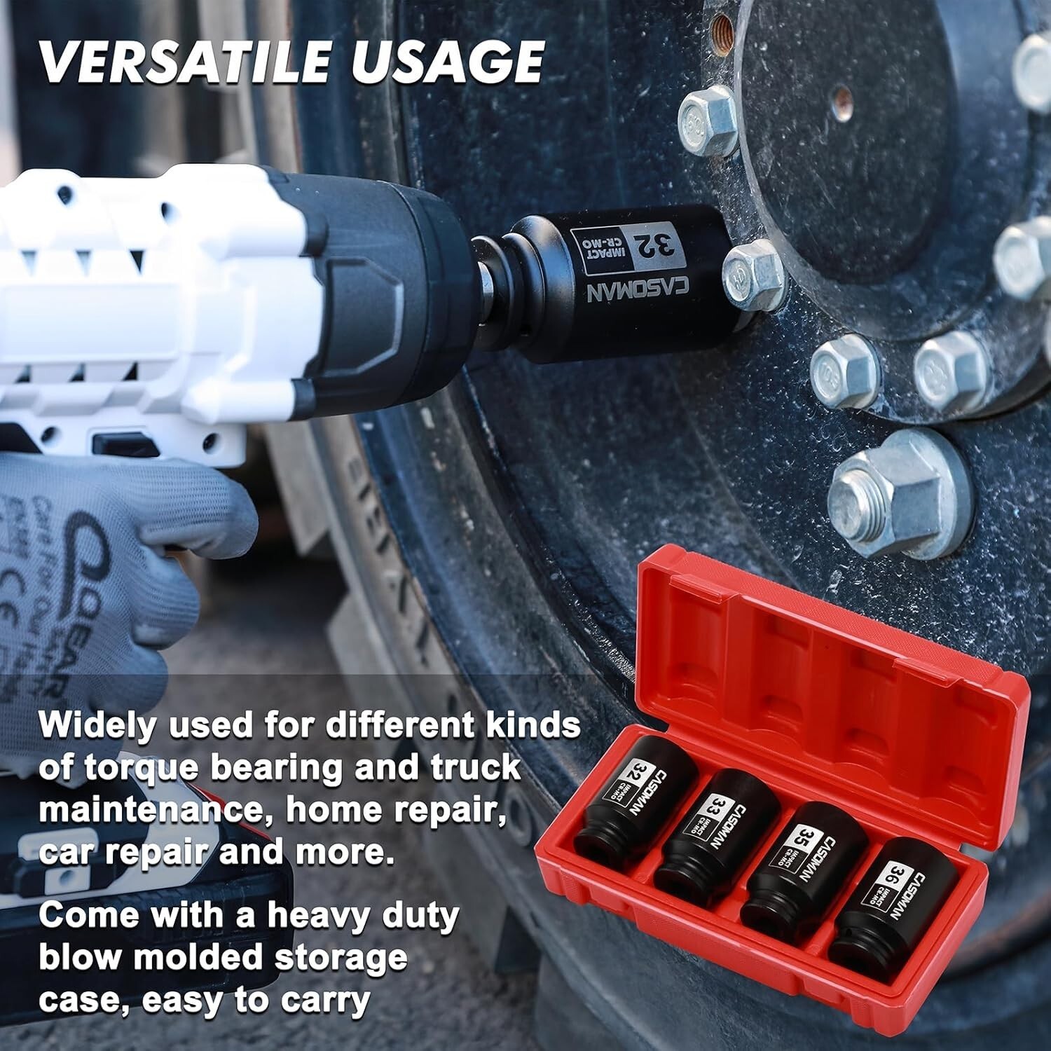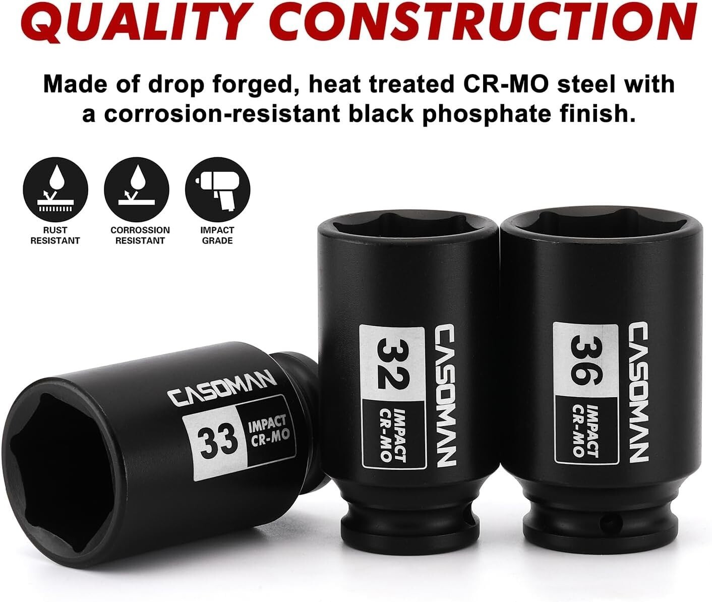 Upgrade your tool collection with this durable 4-Piece Metric Impact Socket Set, featuring 6-point deep impact sockets in 32, 33, 35, and 36mm sizes. Made from drop forged, heat-treated heavy-duty chrome molybdenum steel with a corrosion-resistant black phosphate finish, these sockets are designed for maximum strength and longevity. The high-contrast laser-etched size markings ensure easy identification, even in low-light conditions. The set includes a sturdy blow-molded storage case for convenient transport and organization. Suitable for removing, installing, and repairing hub or axle nuts on most American and imported vehicles, and meeting or exceeding ANSI standards. Backed by a 1- quality . To ensure fast and reliable delivery, we work with multiple fulfillment partners and suppliers. Depending on availability and location, your order may ship from different warehouses or arrive in packaging that varies from item to item. Tracking details are typically provided shortly after shipment, and customer satisfaction remains our top priority. Please note that due to carrier policies and regional regulations, certain items may not be eligible for delivery to specific states or territories.