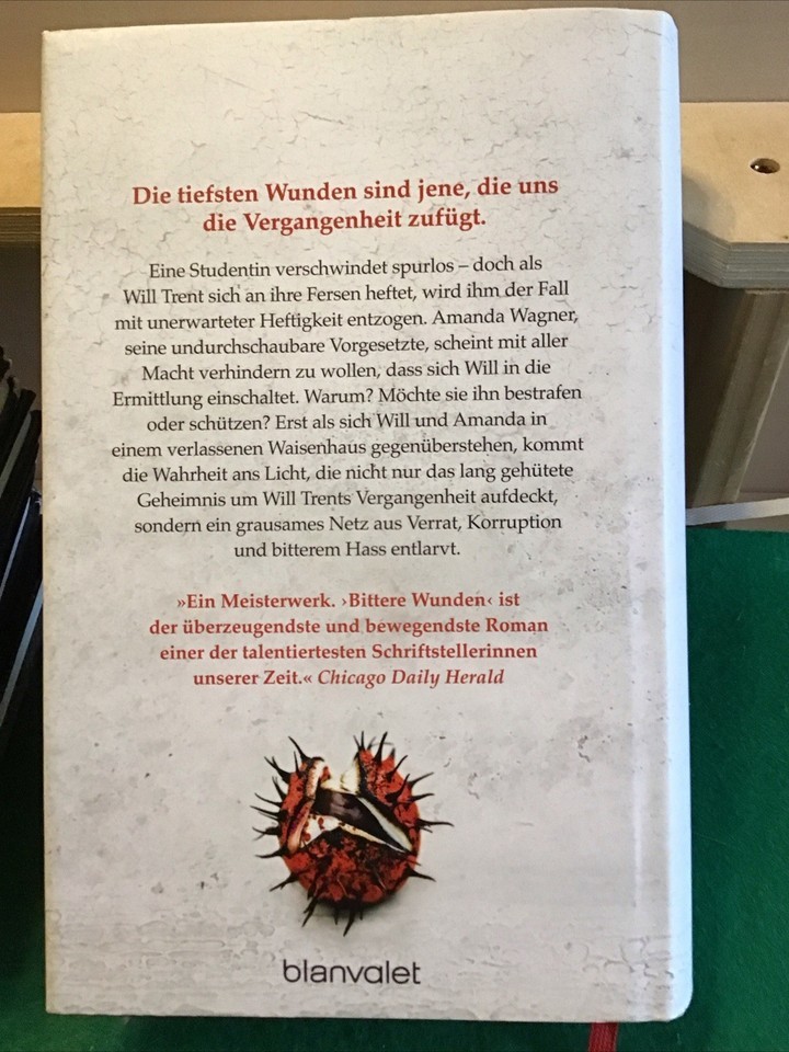 The product is a German language book titled "Bittere Wunden" by Karin Slaughter, published by Blanvalet in 2014. It falls under the genre of Krimis und Thriller, making it a gripping and suspenseful read. The book explores themes of psychological and emotional intensity, following the author's signature style of intricate plots and well-developed characters. Perfect for fans of German literature and thrillers, "Bittere Wunden" promises to captivate readers with its compelling narrative and engaging storytelling.
