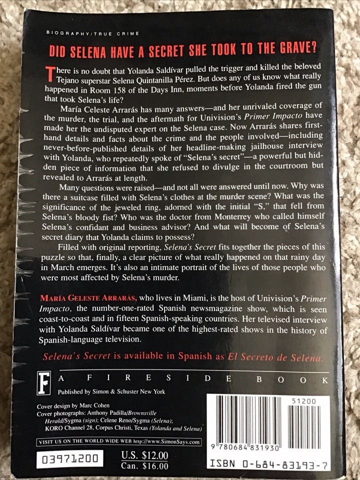 "Selena's Secret: The Revealing Story Behind Her Tragic Death by Arraras" is a trade paperback book published by Simon Schuster in 1997. Written by María Celeste Arraras, the book delves into the true crime and music genre, providing a detailed account of the late singer's tragic death. The book, featuring 256 pages and illustrations, offers readers an in-depth exploration of the events surrounding Selena's demise, making it a compelling read for fans of the entertainment and performing arts.