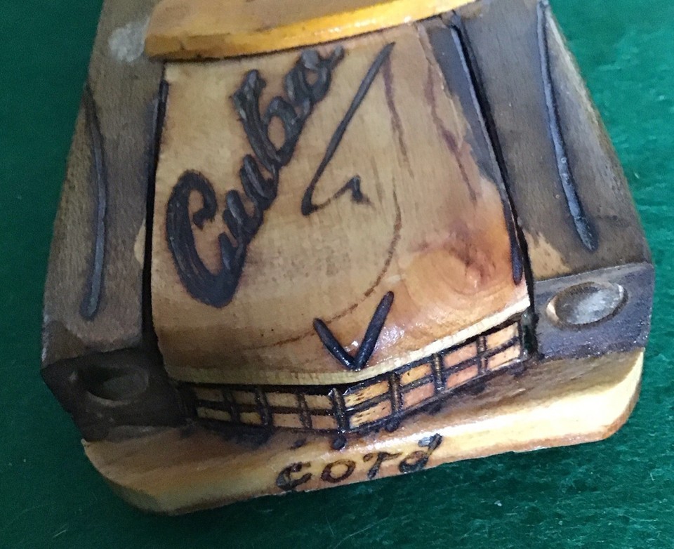 This product is a vintage Ford Thunderbird car made of wood, hand carved and lacquered. The hood and trunk are open, adding to its unique appearance. Created in Cuba, this one-of-a-kind folk art piece appeals to collectors and those interested in vintage automotive decor. Its medium size and brown color make it suitable for any room in the house, with a timeless design that can be enjoyed by teens, boys, adults, girls, and kids alike.