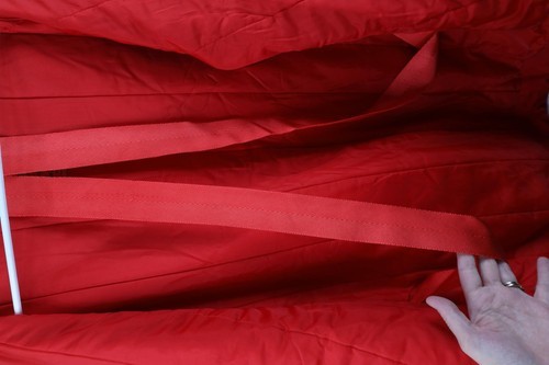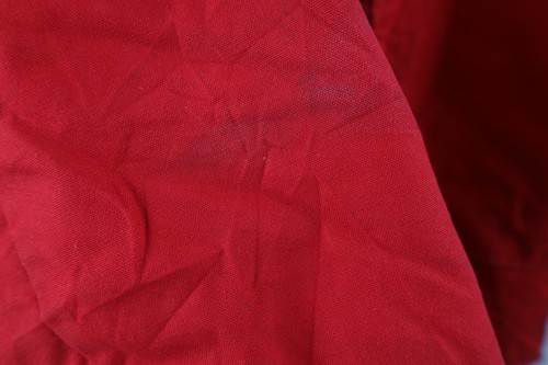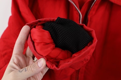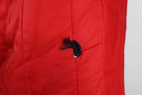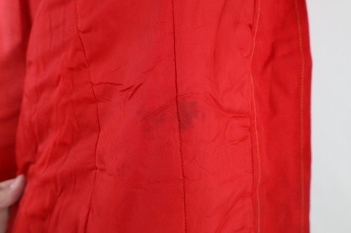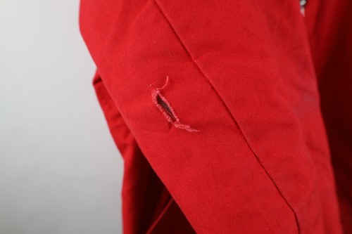 Hole right arm. Missing metal ring on back. Stains/dark spots throughout. Collar, cuffs, inner lining discolored. String, straps distressed inner lining. Inner cuffs pilled. Cuffs worn. Loose threads tags. Color faded. Loose seams throughout. Made in USA