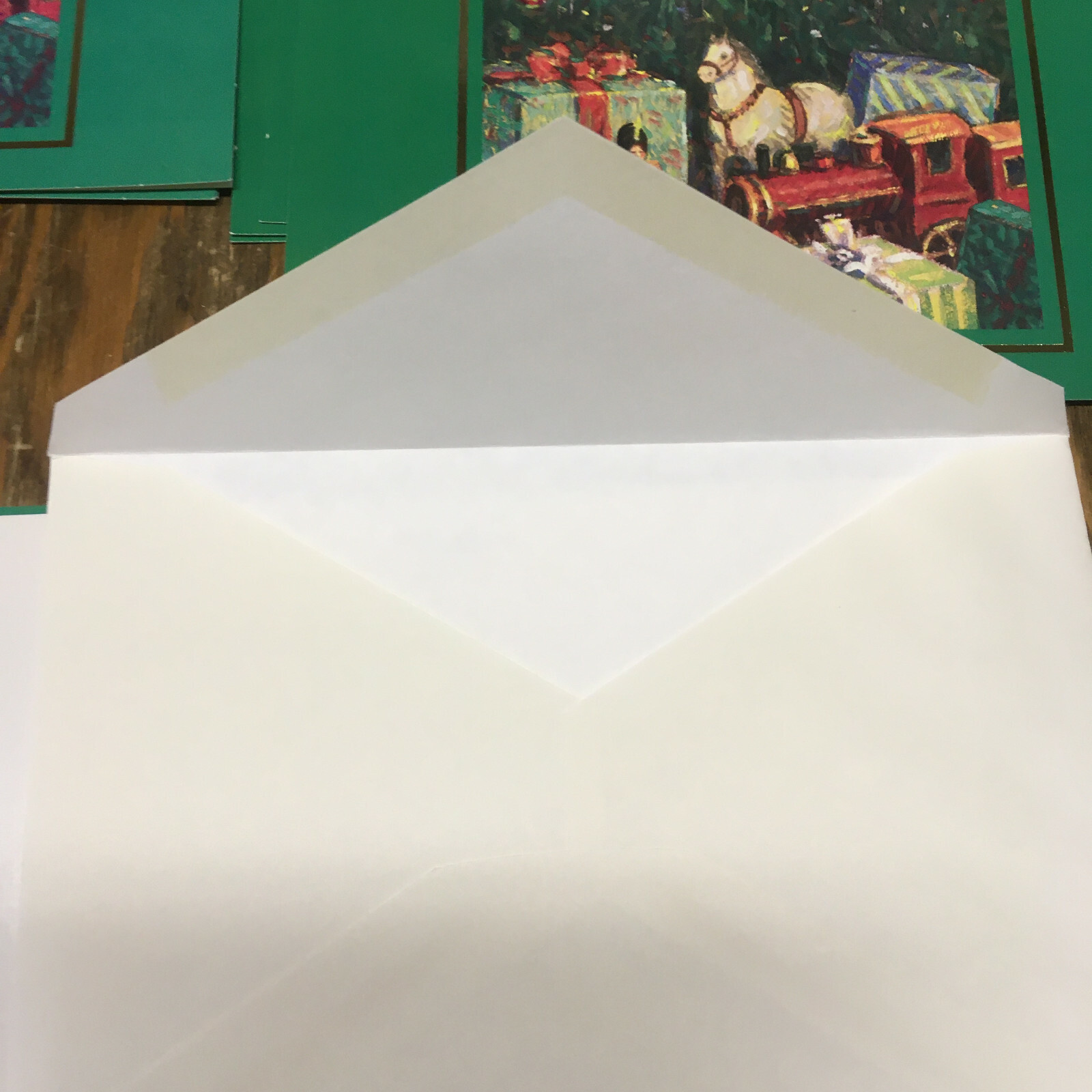 Vintage Christmas greeting cards green cards with presents under the tree