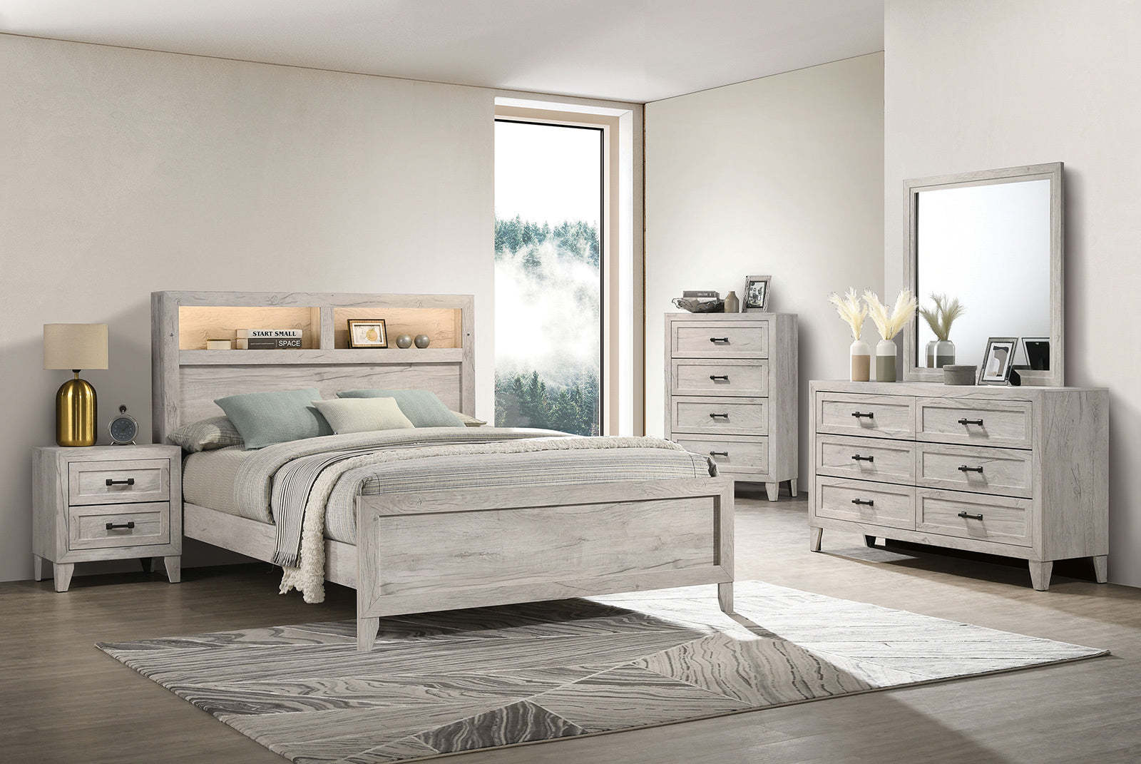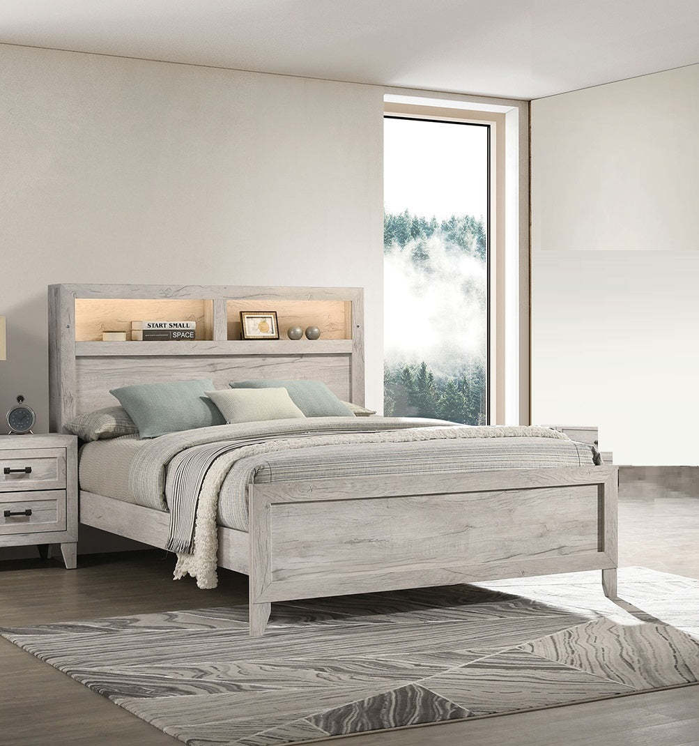 White Wash Queen Bed w/ Headboard, Shelves & LED Light - Contemporary