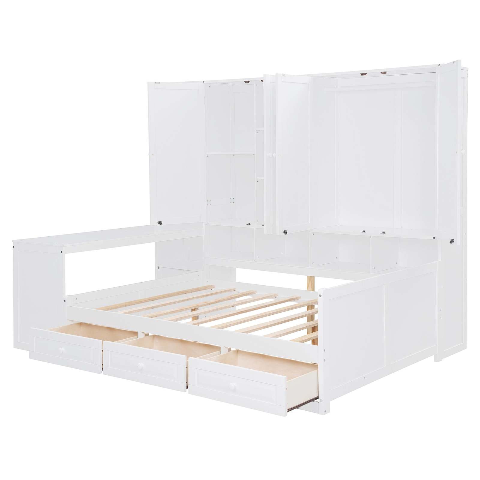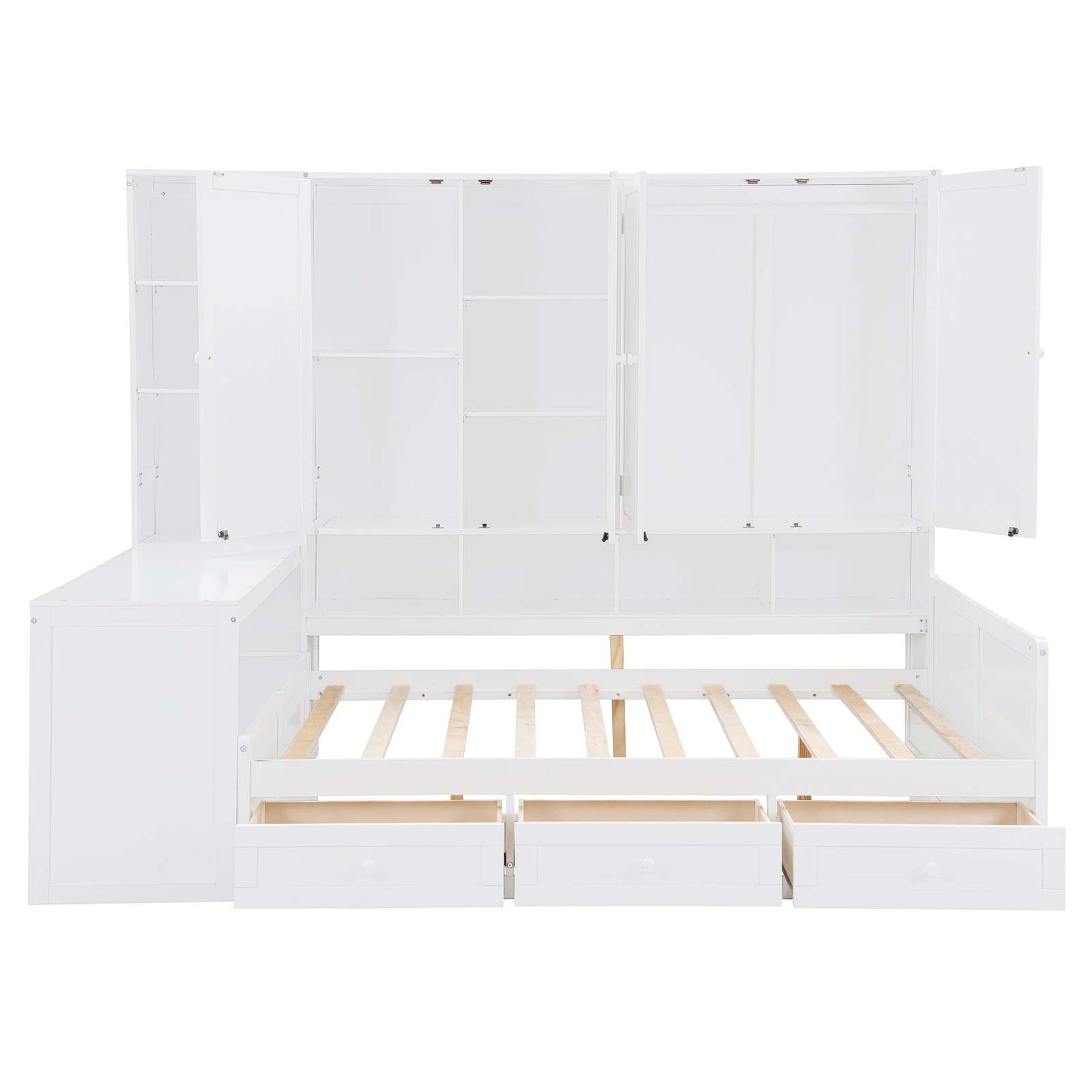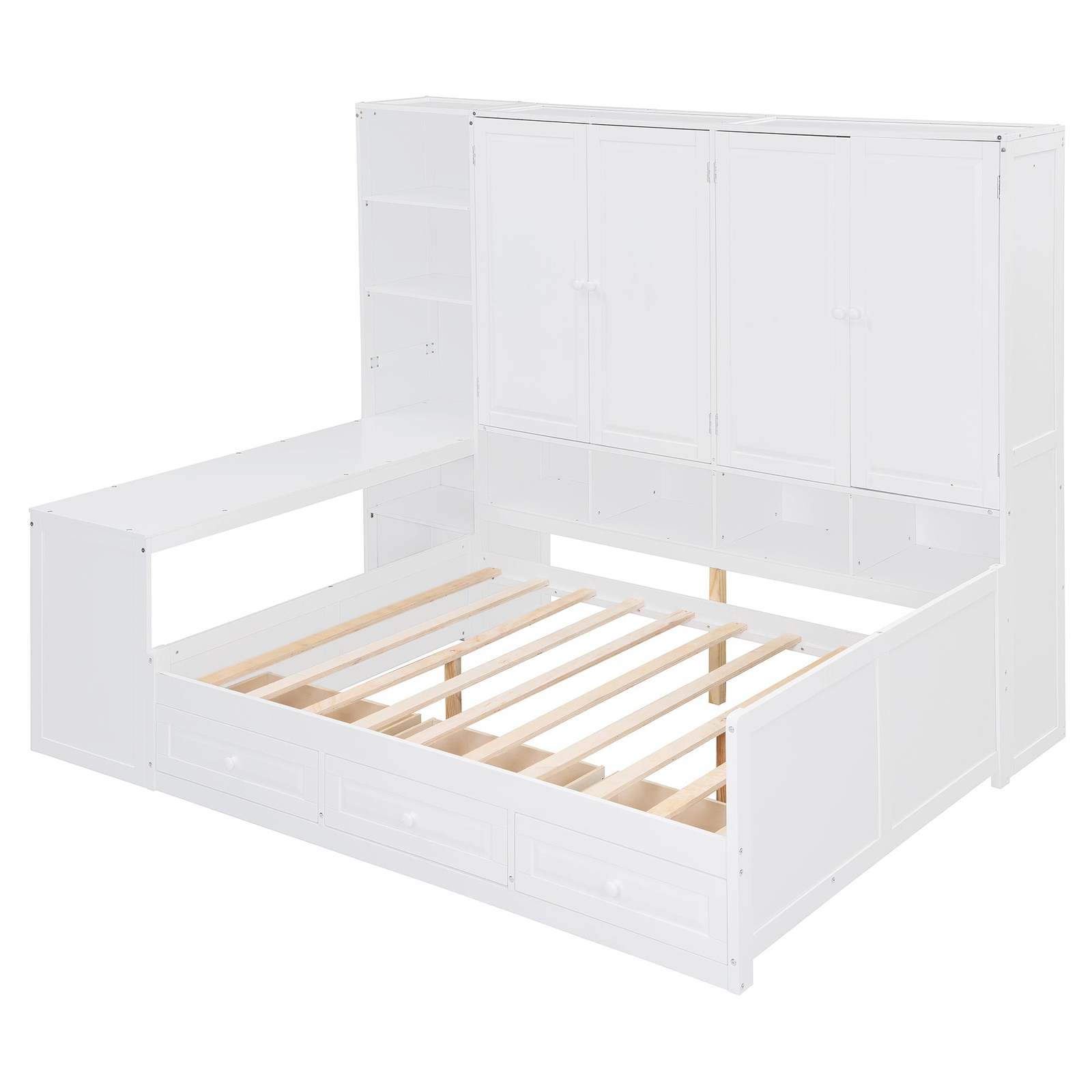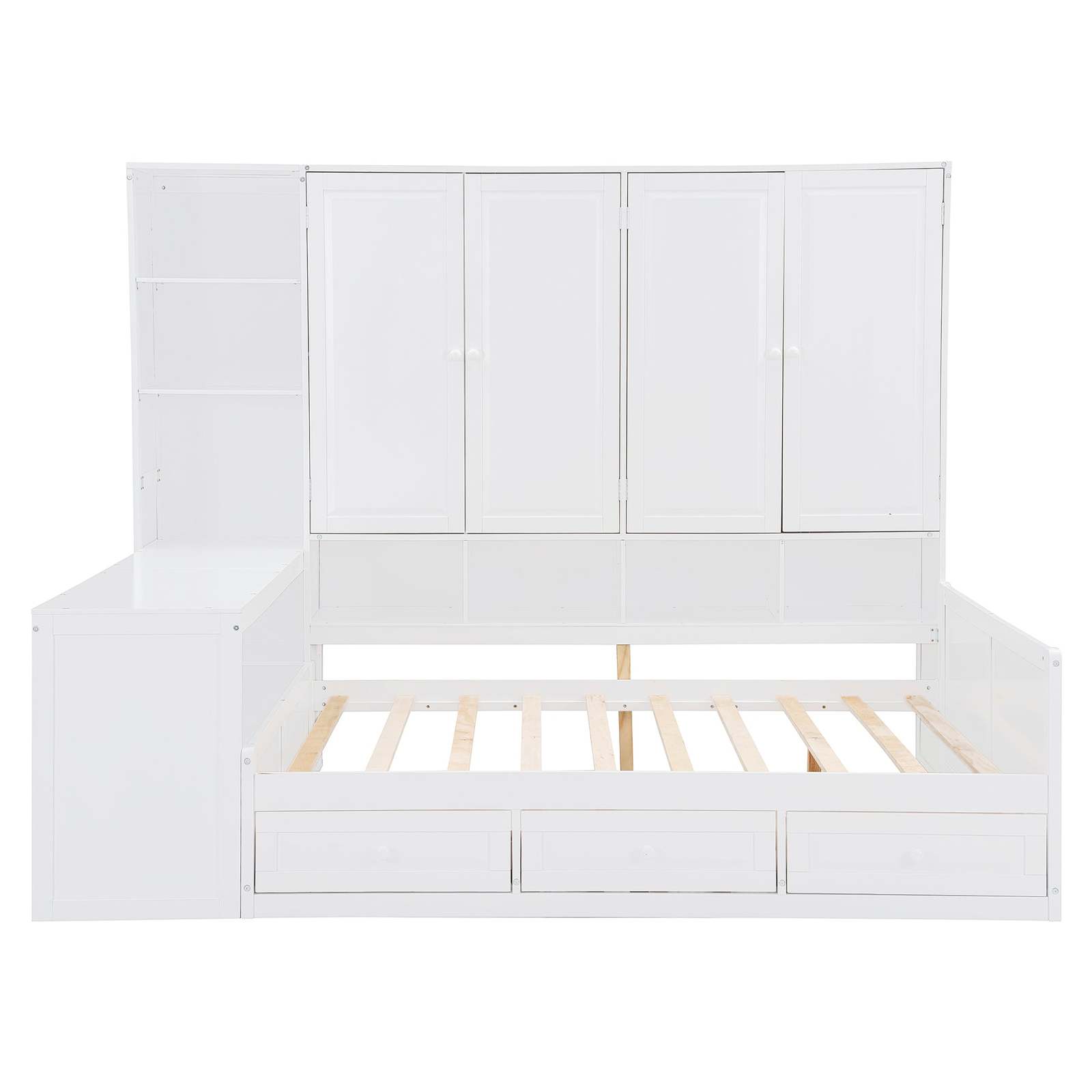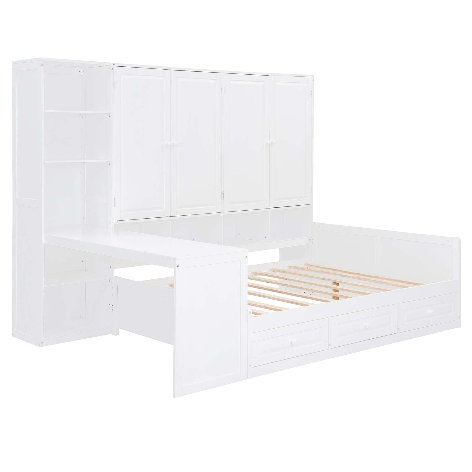 White Full Size Wooden Daybed with 3 Drawers, Desk & Shelves