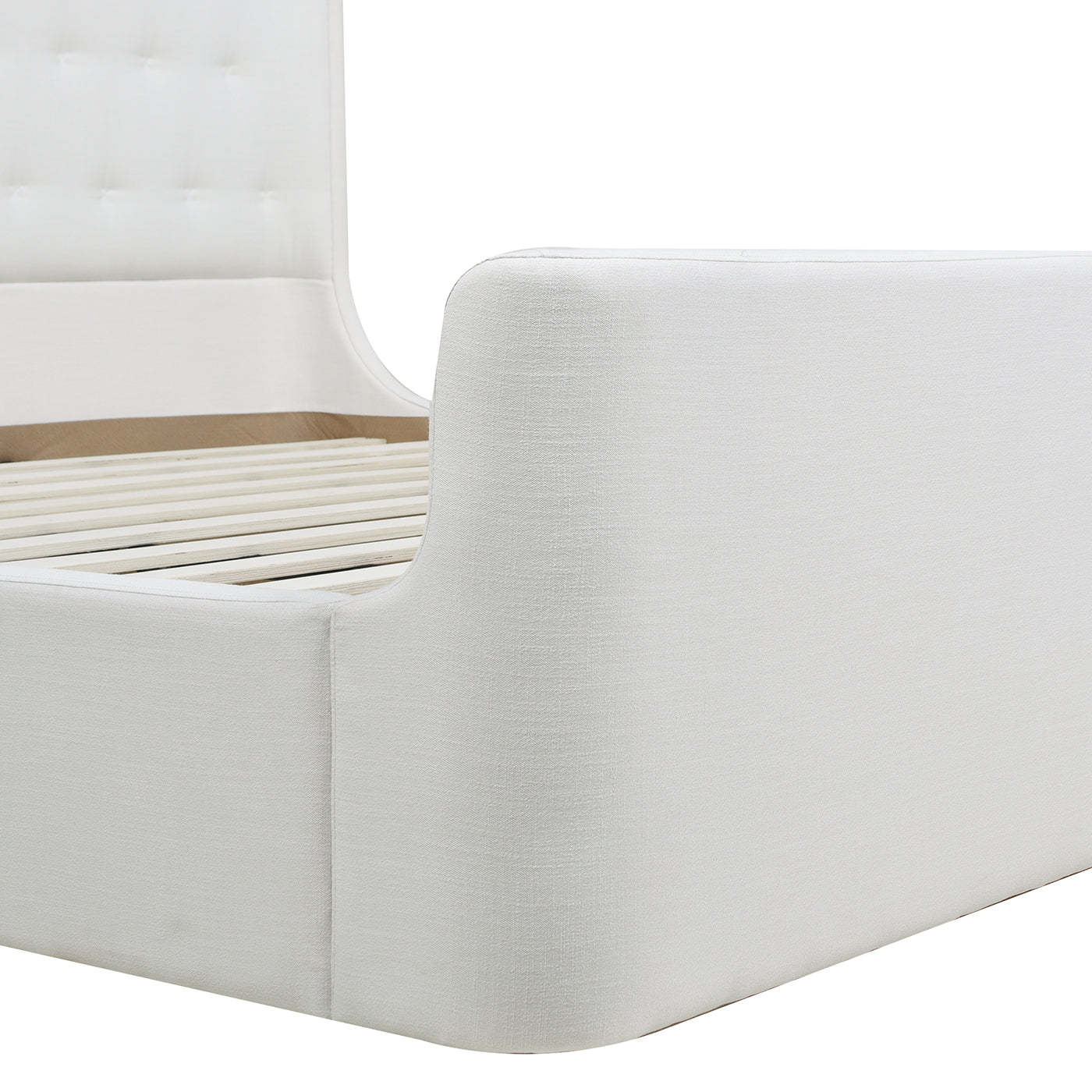 Delicate biscuit pin-tufting along the headboard