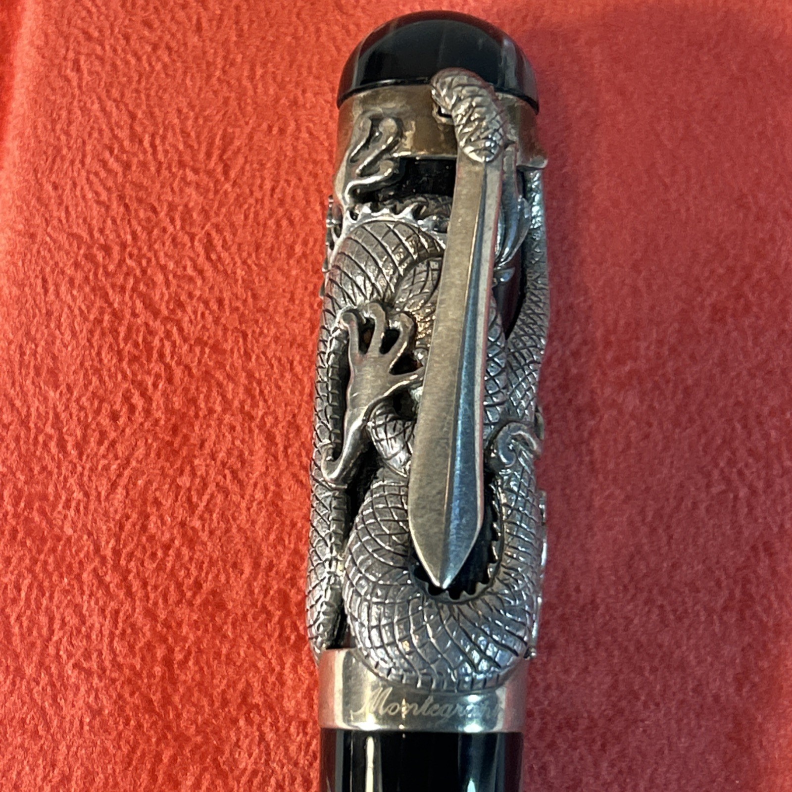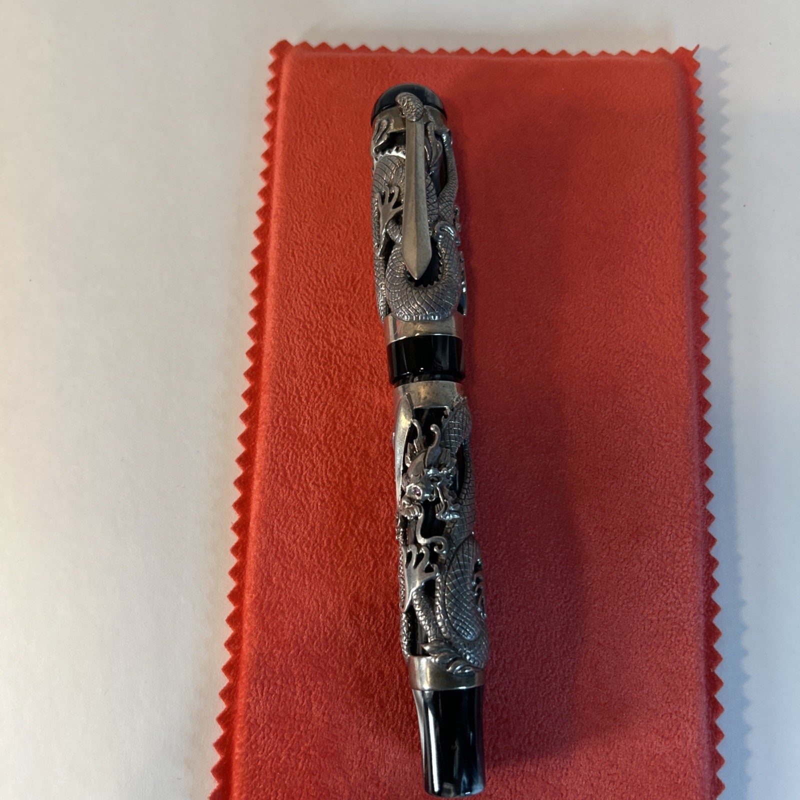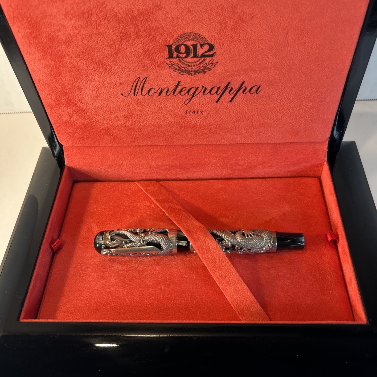 This is an ultra-rare Montegrappa ?The Dragon? fountain pen from the Oriental Zodiac Collection?limited edition #1738 of only 1912 pieces made in 1995. Featuring an intricate sterling silver dragon overlay, this handcrafted Italian masterpiece is a showpiece for any serious pen collector. Includes the original lacquered wood presentation case, outer box, certificate of authenticity, and unopened booklets. Please note: one hinge on the box was professionally reinforced after a common screw issue?see final photo for close-up.