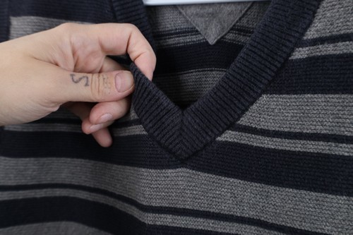 Collar, armpits, bottom discolored. Color faded. Pilling