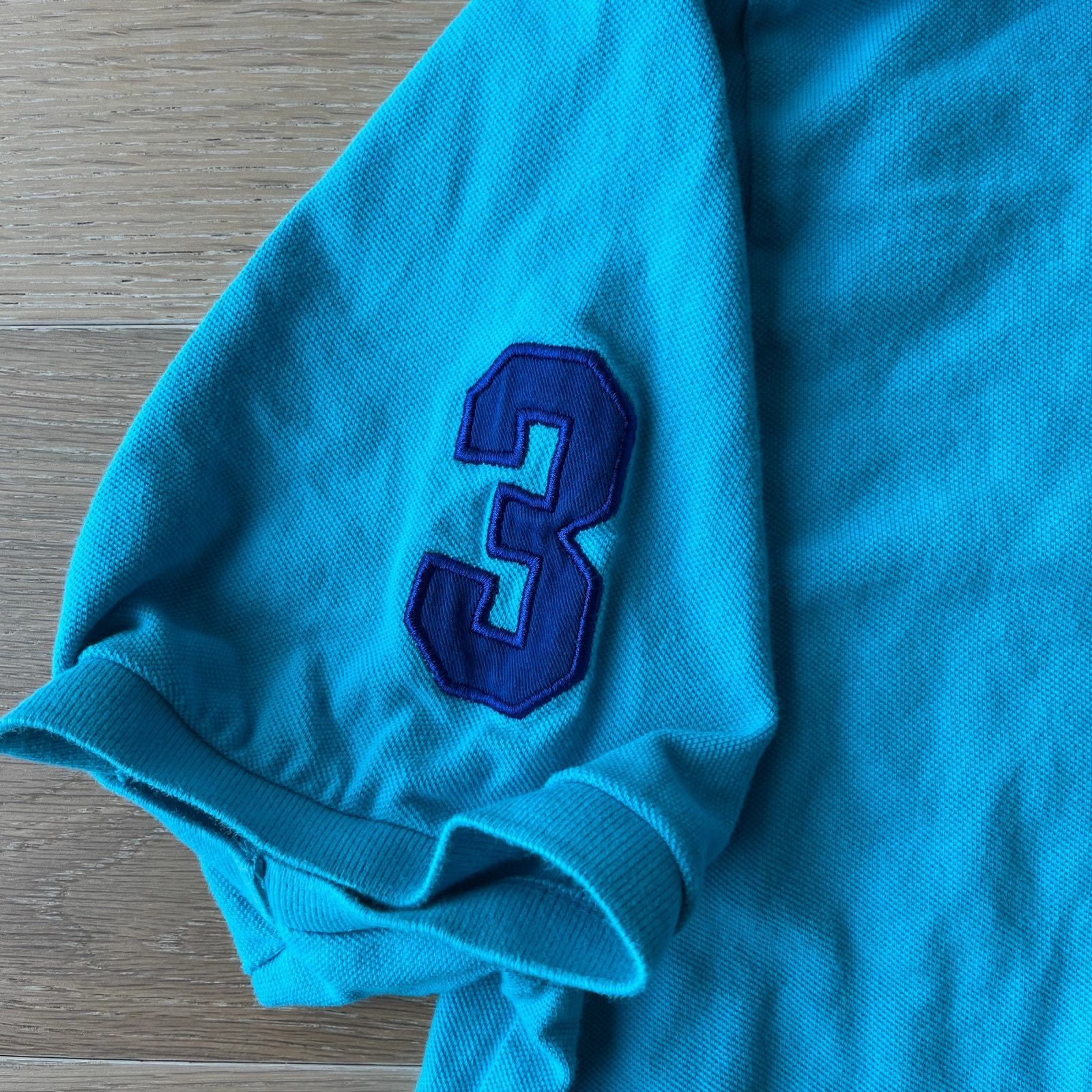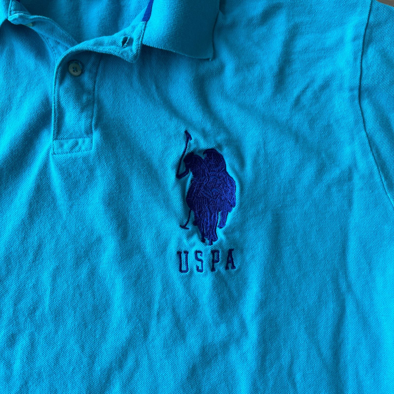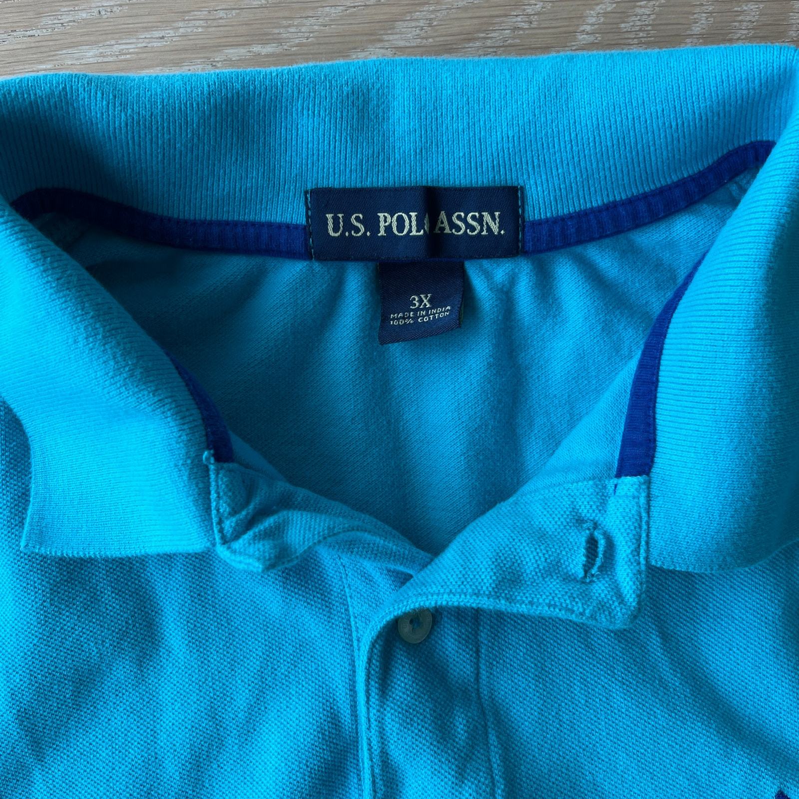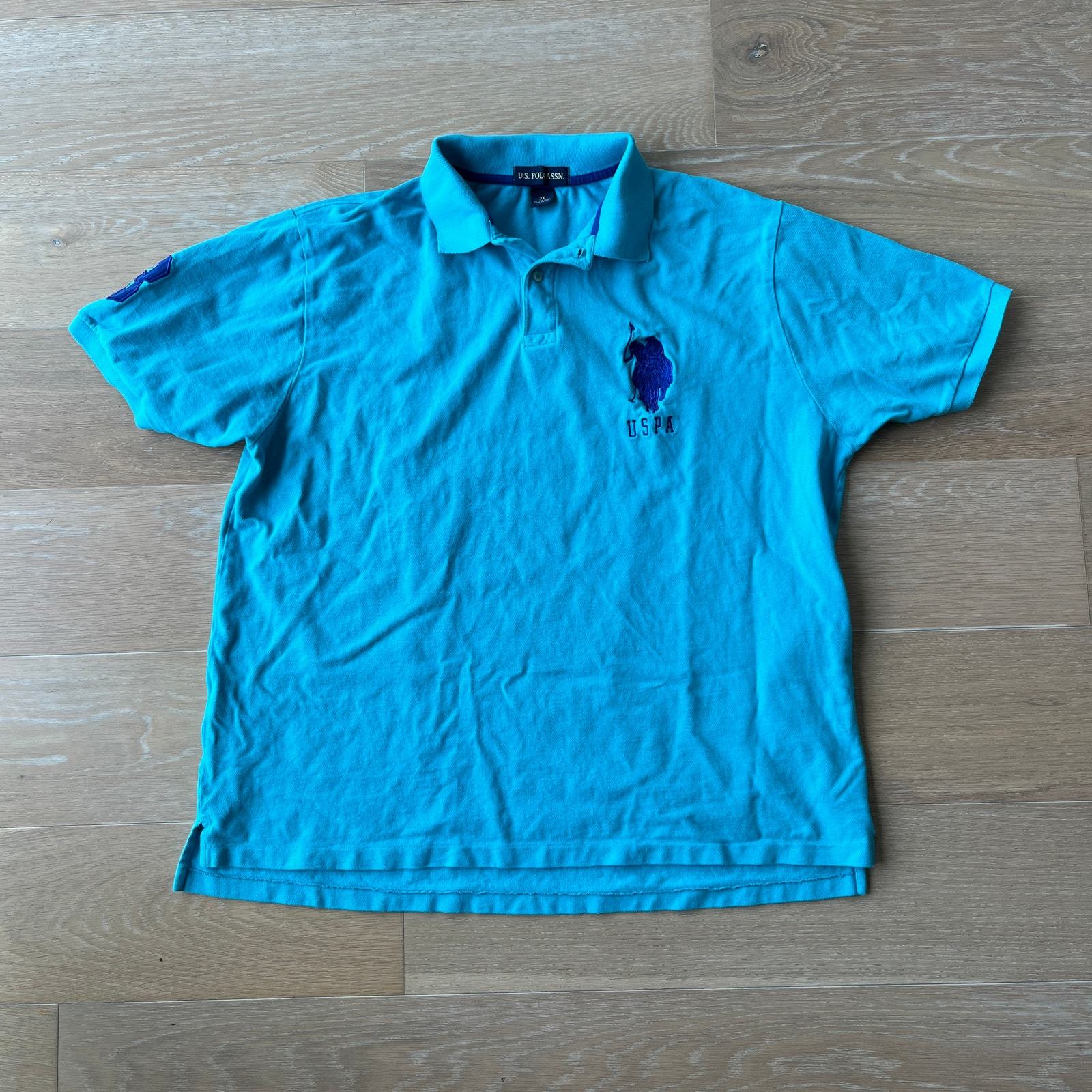 U.S. Polo. Assn (USPA) short sleeve polo shirt with large embroidered polo player. Great preowned condition with no holes or stains. Men's size 3X. Dark turquoise color with navy embroidery.