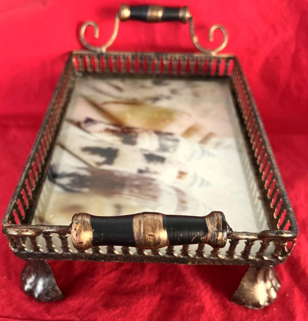 Vintage Black Gold Metal 2 Handle Tray w Glass Insert 4 Claw Legs
