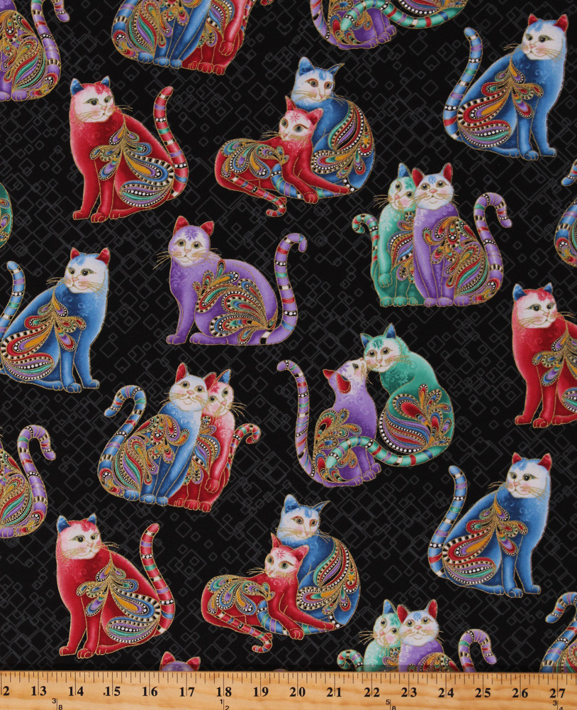 Cotton Playful Cats Whimisical Felines Animals Colorful Paisleys Gold Metallic Shimmer on Black Cat-i-tude 2 PurrFect Together Cotton Fabric Print by the Yard (7559M-12)