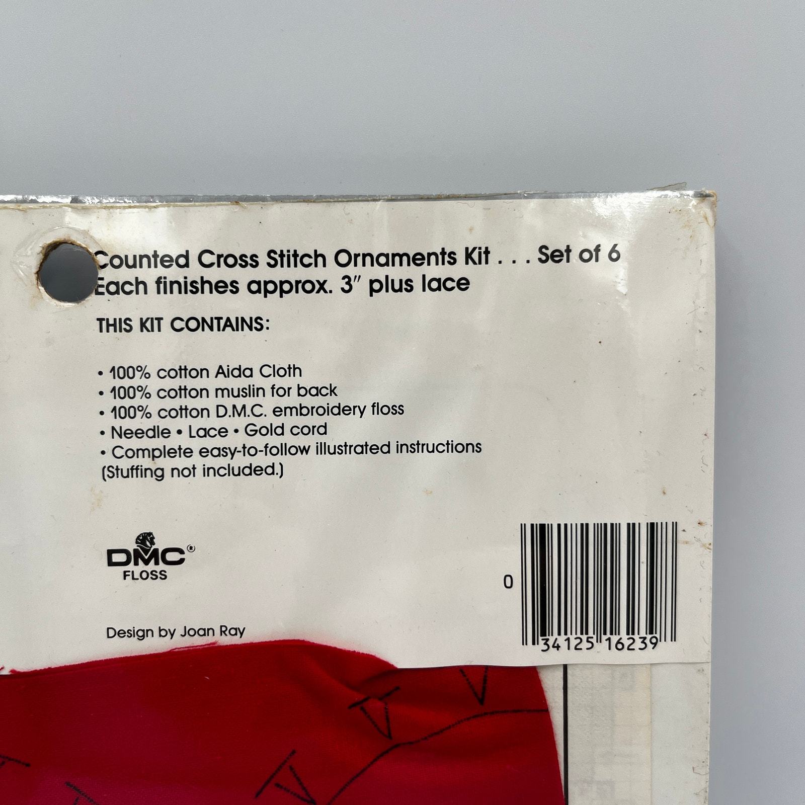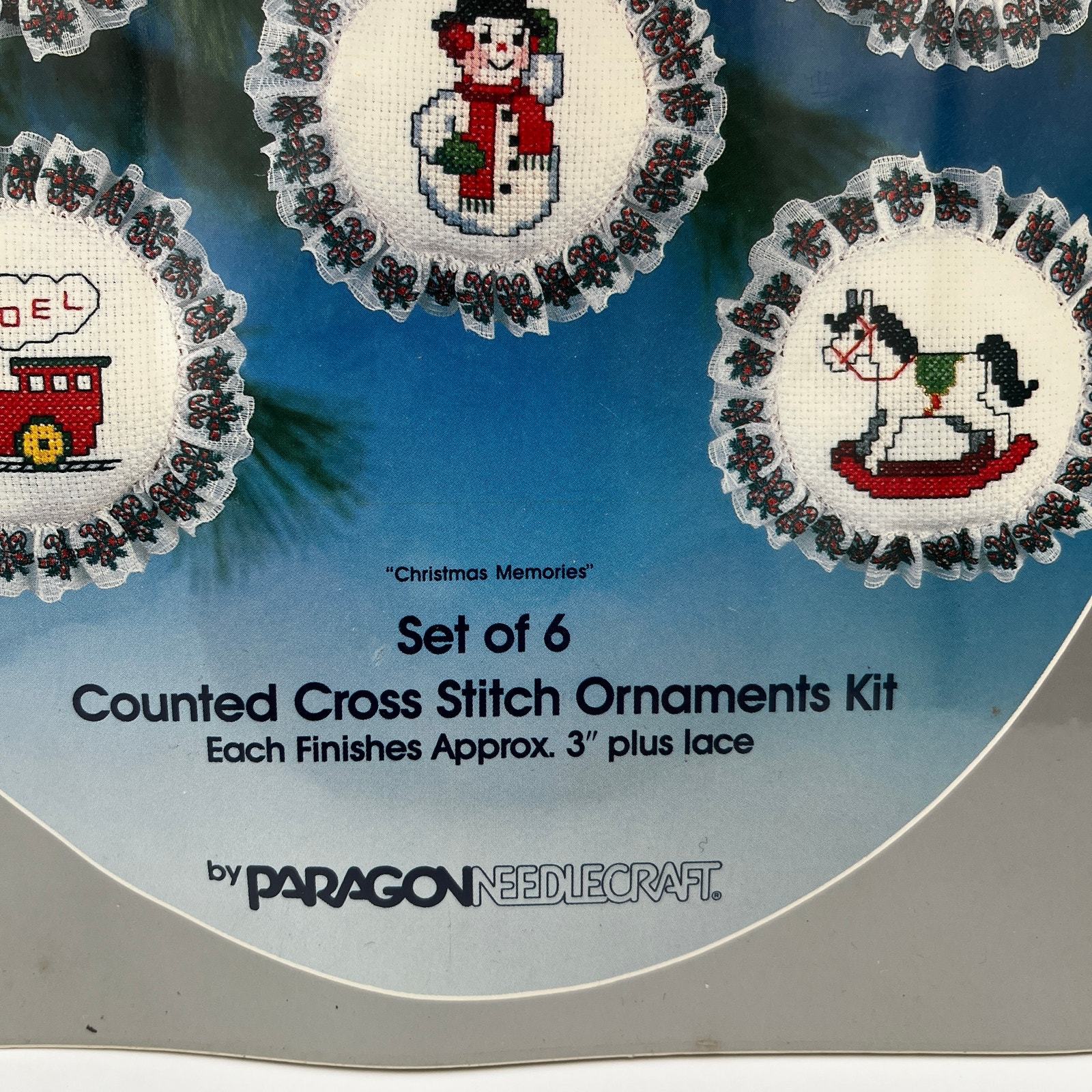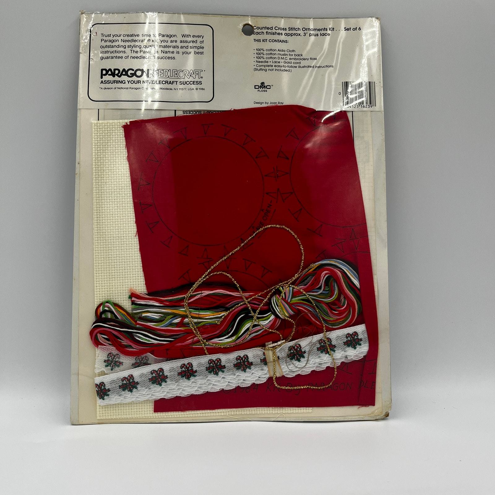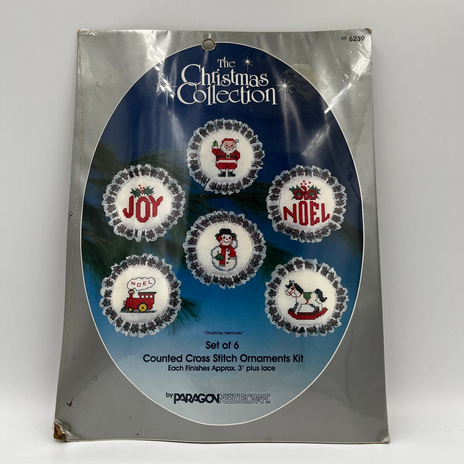 Vintage Paragon Needlecraft "The Christmas Collection" Set of 6 Counted Cross Stitch Ornaments Kit #6239. Each finishes approximate 3" plus lace. The kit is complete and never been opened.