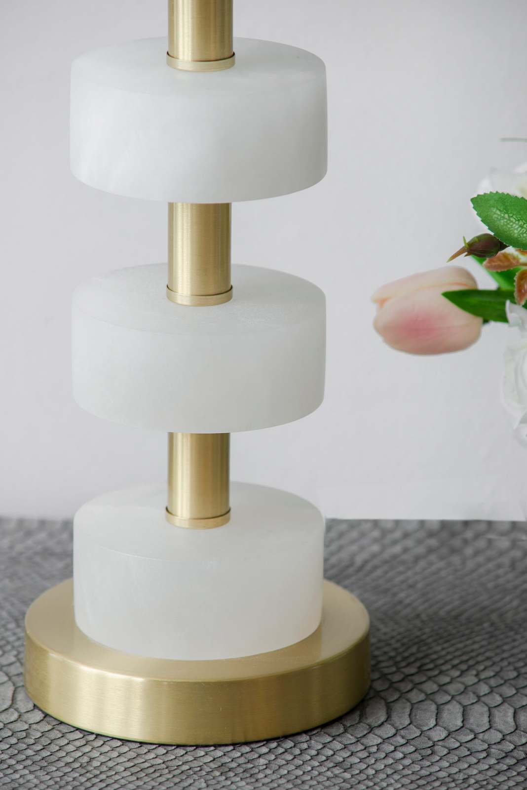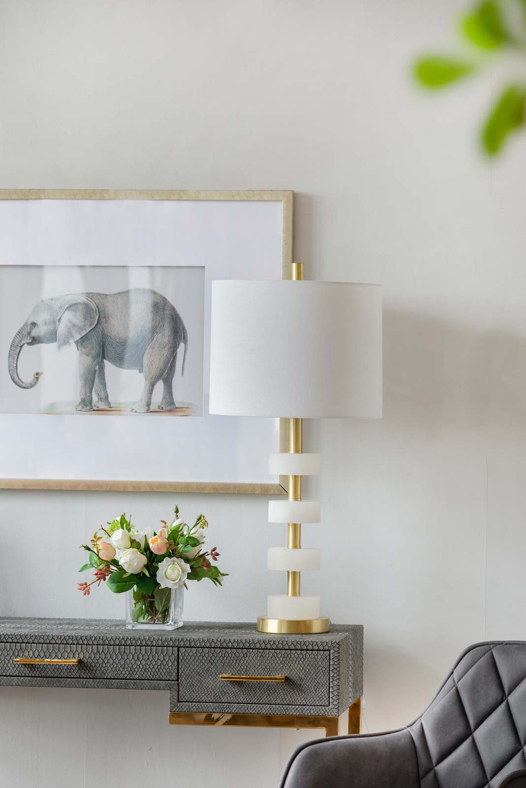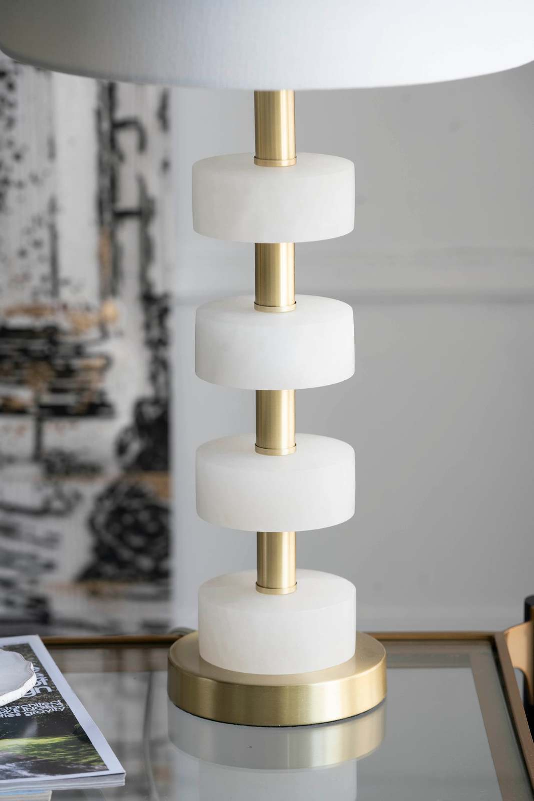 The lamp provides a balanced, ambient glow that enhances your existing lighting and sets a welcoming mood in any space. The marble base offers stability and a timeless aesthetic, while the warm gold detailing adds a touch of sophisticated glamour that pairs well with a wide range of decor styles. Elevate your bedside, living area, or workspace with a refined piece that effortlessly blends classic material with contemporary charm.