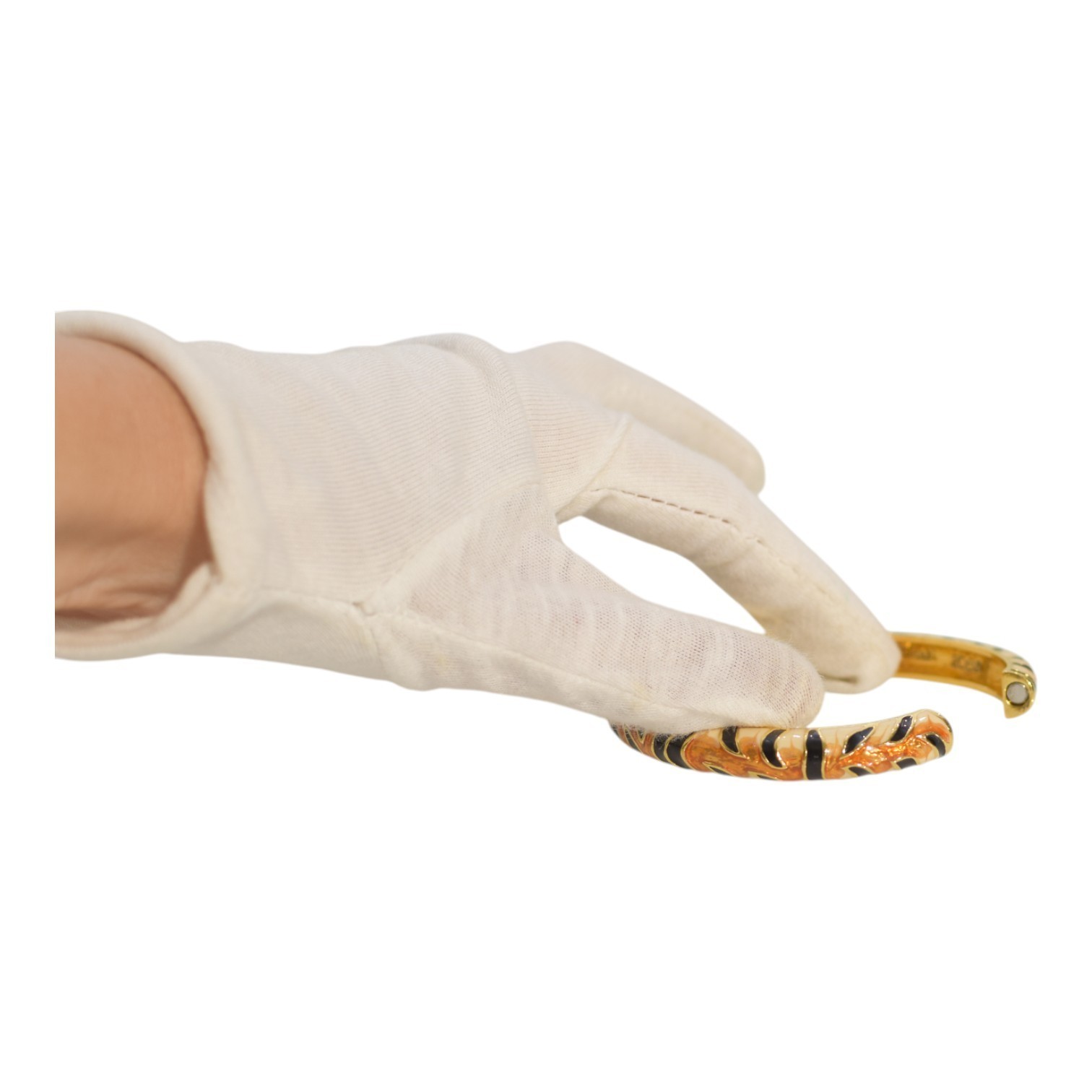 The KENNETH JAY LANE Enamel Cuff Bracelet in tiger print is a stylish and versatile piece of jewelry perfect for various occasions such as engagements, birthdays, and anniversaries. This cuff bracelet is made of goldplated brass with a spring ring closure and features a beige brown and black animal print enamel design. It is signed by the renowned brand Kenneth Jay Lane and is stackable, adding versatility to your jewelry collection. This vintage-inspired piece has a round shape and is a unique addition to any outfit.