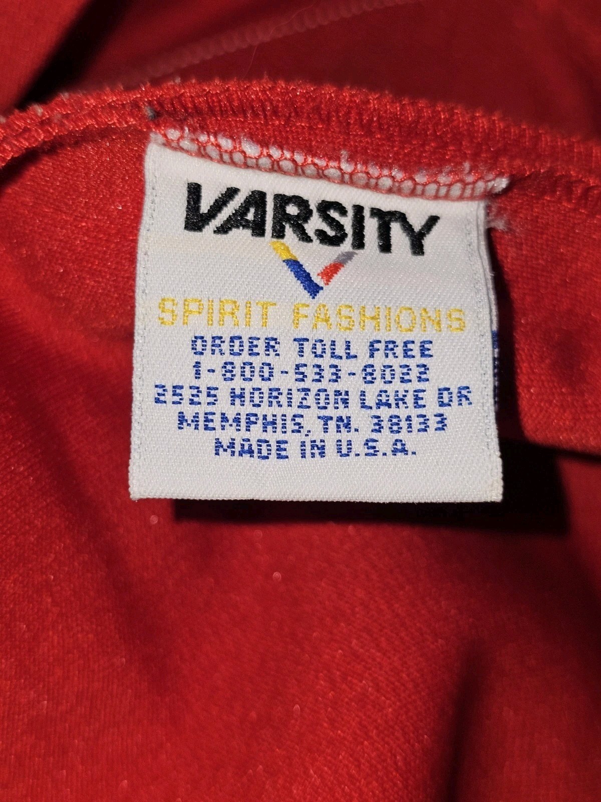 The size Tag is unreadable, so please look at the measurements. I have included in the photos. This vintage cheerleader outfit from Varsity is perfect for Halloween, featuring a classic red, black, and white color scheme. Made of polyester, this outfit is durable and suitable for all seasons. The size S/M regular fit makes it ideal for women looking to channel their inner cheerleader, whether for a show or just for fun. Made in the United States, this unique and stylish uniform is sure to make a statement at any event.