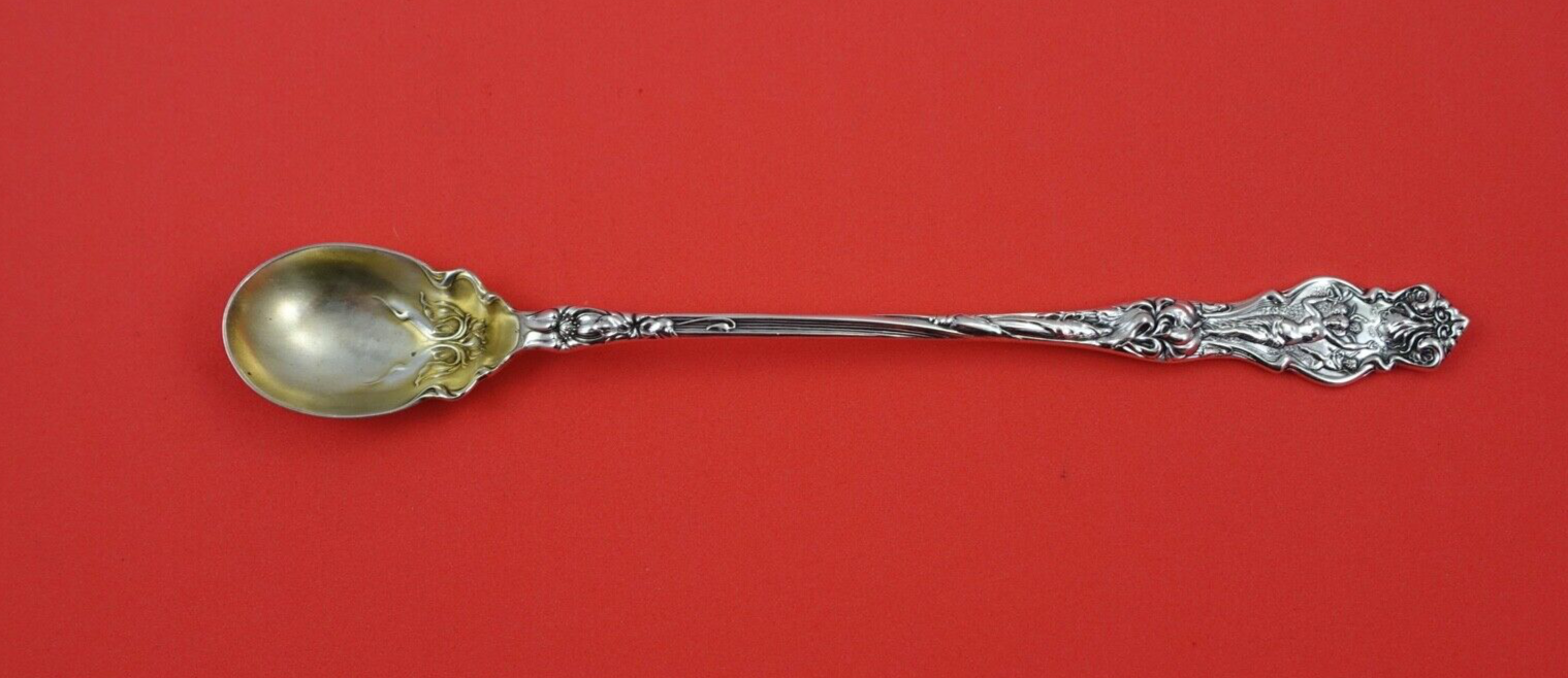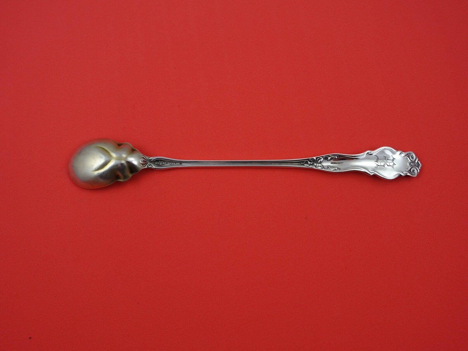 Sterling silver original long Olive Spoon, gold washed, with solid bowl 7 7/8" in the pattern Irian by Wallace. It is monogrammed on the reverse (monos vary) and is in excellent condition.