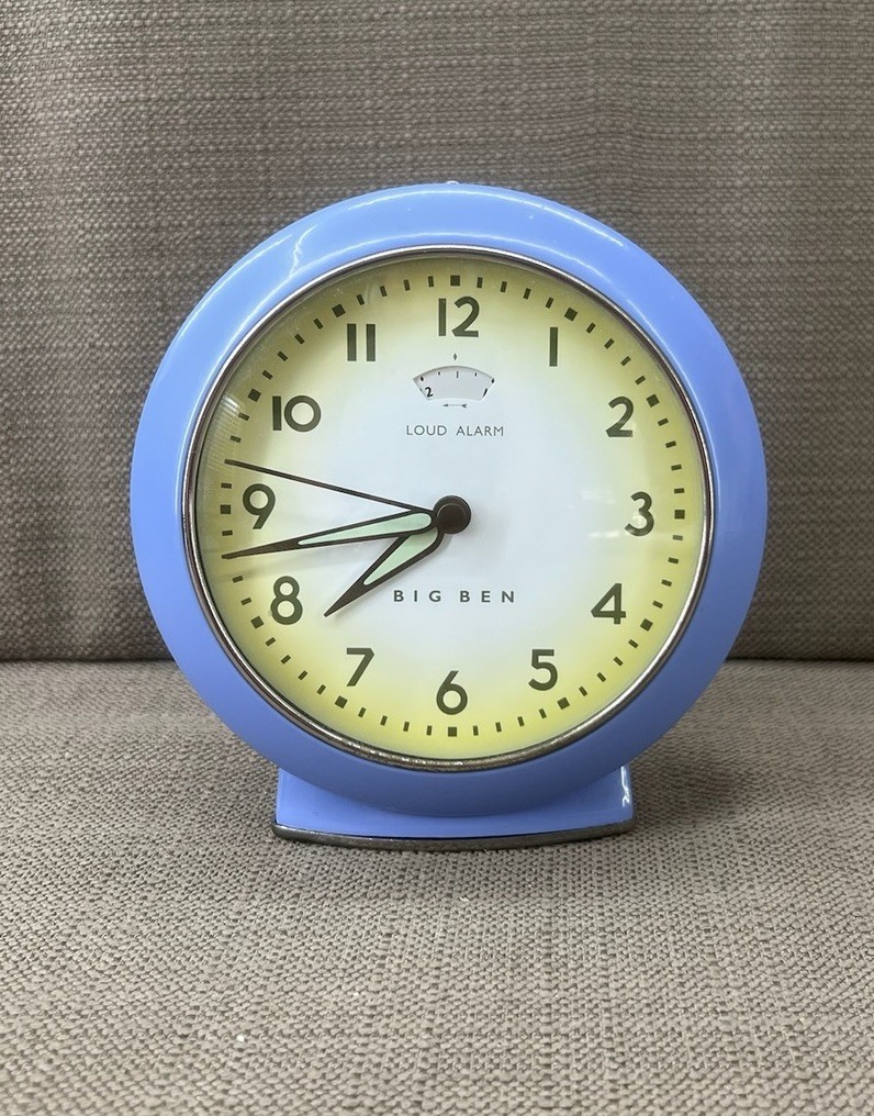 Vintage Big Ben Loud Alarm Clock Blue Metal Retro Desk Clock Works. This charming retro desk clock features a bold blue metal frame, round face, and classic Big Ben design with ?Loud Alarm? dial at the top. The clock is in working condition, making it both a collectible and a functional timepiece. Perfect for adding a touch of mid-century modern style to your office, bedroom, or vintage collection.