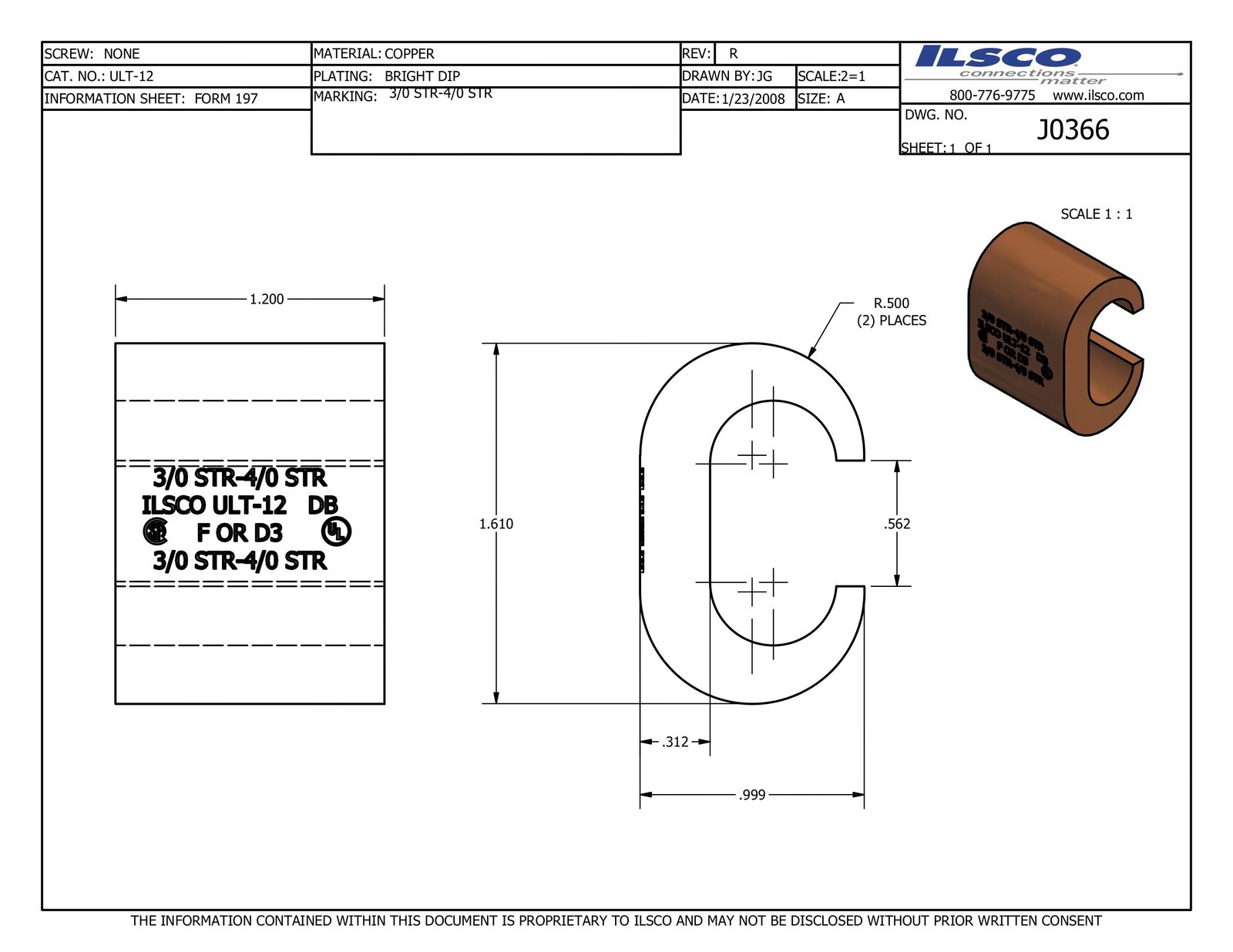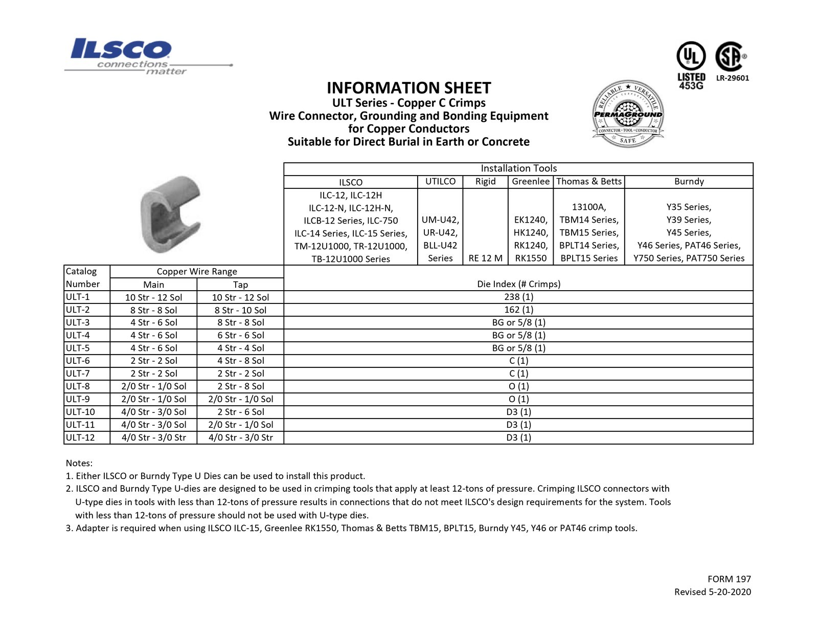 Ilsco ULT-12-Z Permaground Copper Grounding C Crimp 4/0 or 3/0 Stranded