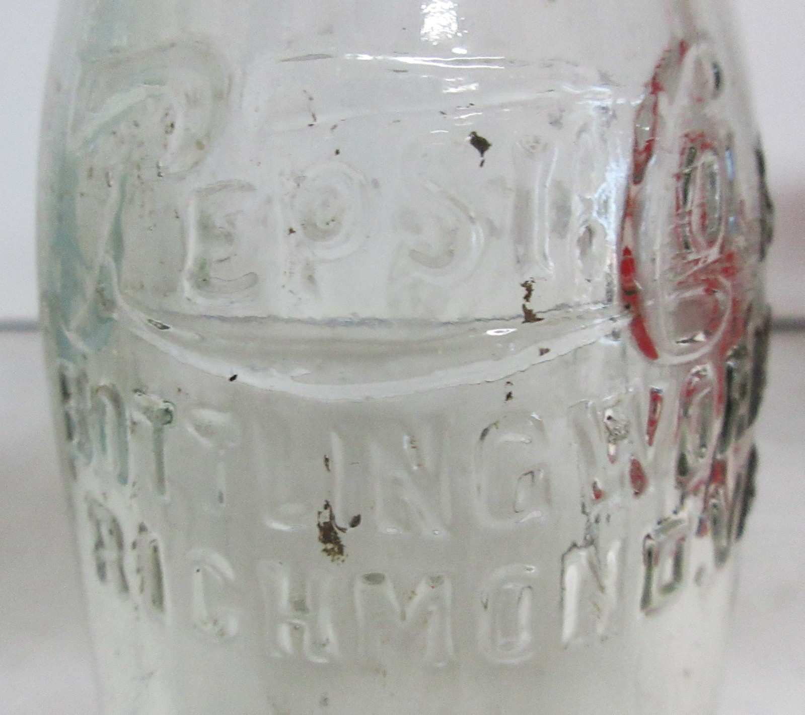 Embossed on the top front of the bottle "Pepsi:Cola" logo "Bottling Works" "Richmond, VA."