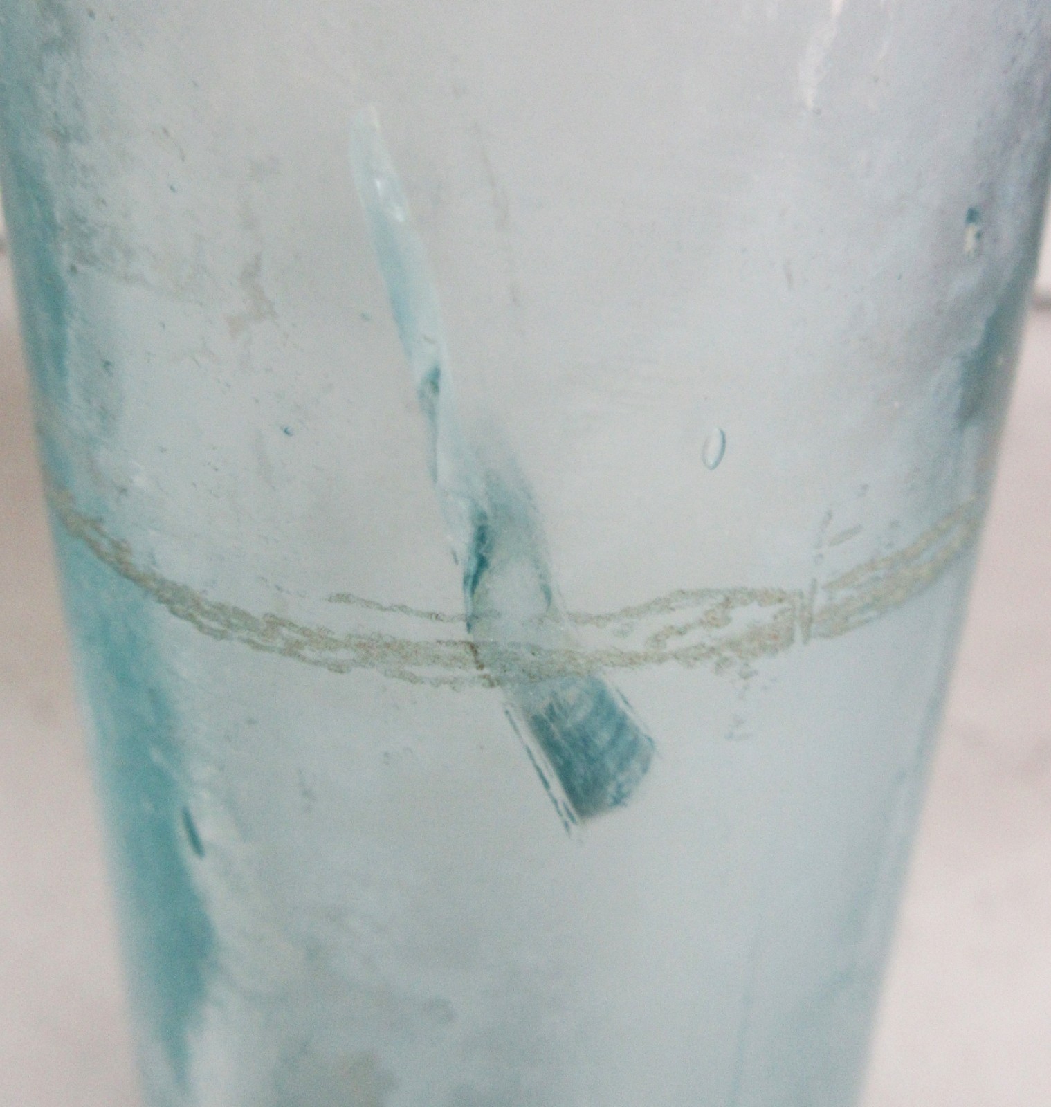 An original green tint glass bottle with embossed lettering measures 9" tall by 2" in diameter