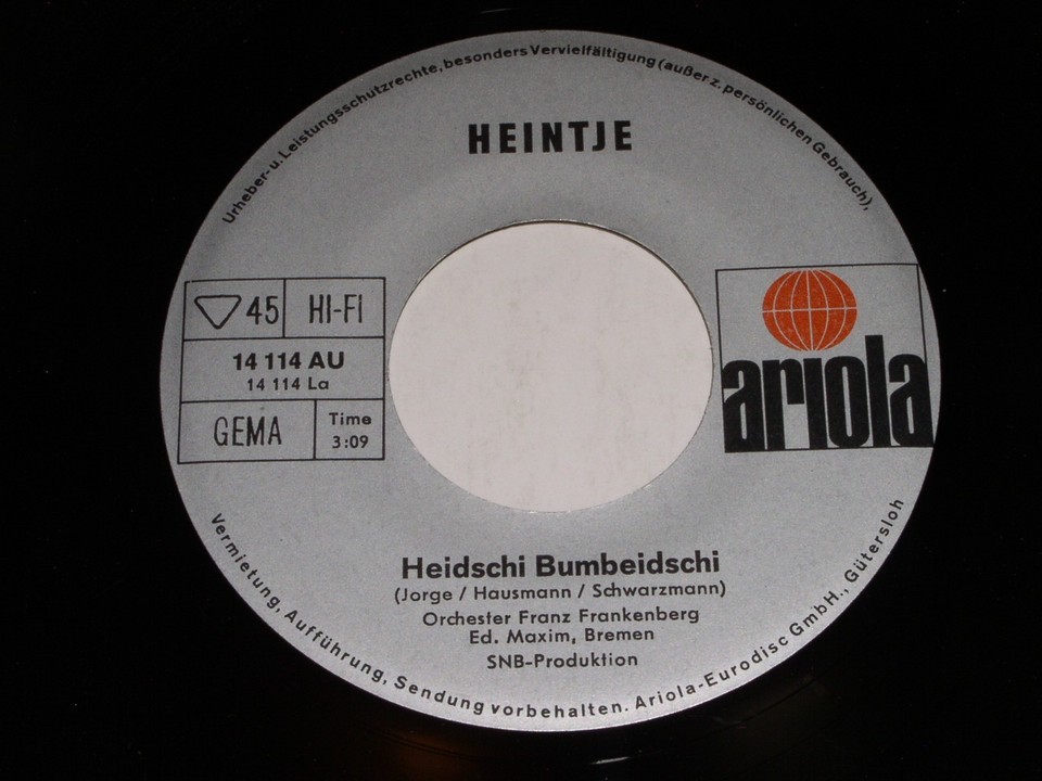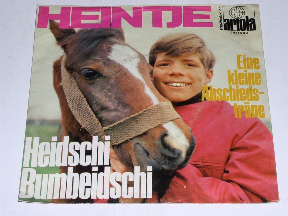 This is a vintage import 45 rpm phonograph record by Heintje, entitled, "Eine Kleine Abschieds-Trane". Flipside: "Heidschi Bumbeidschi". Record label: Ariola 14114 AU.