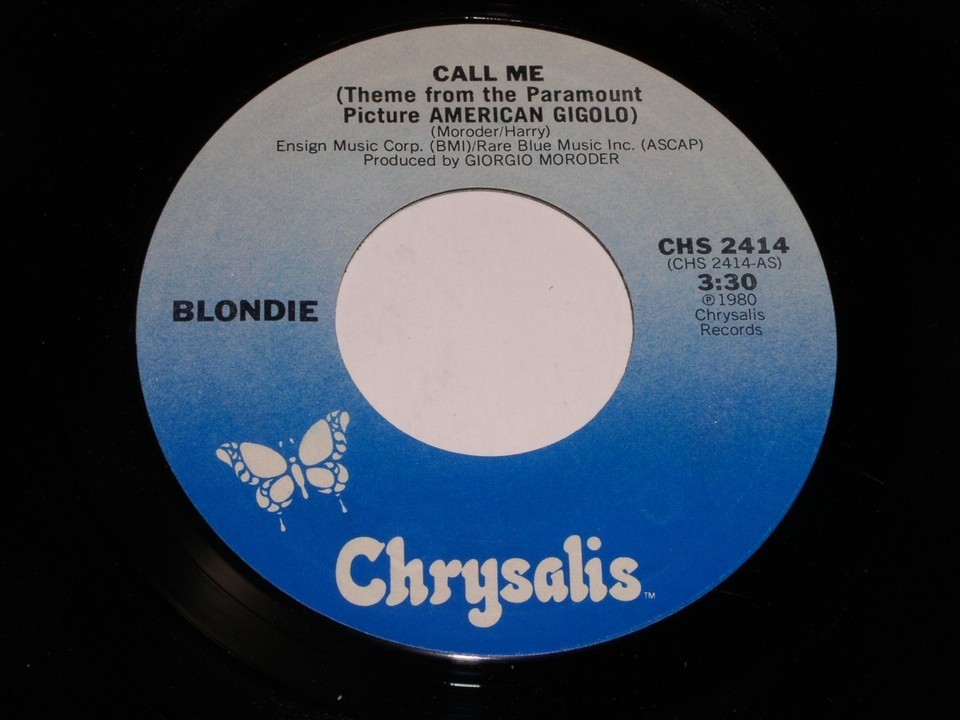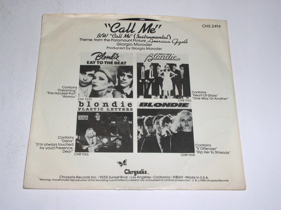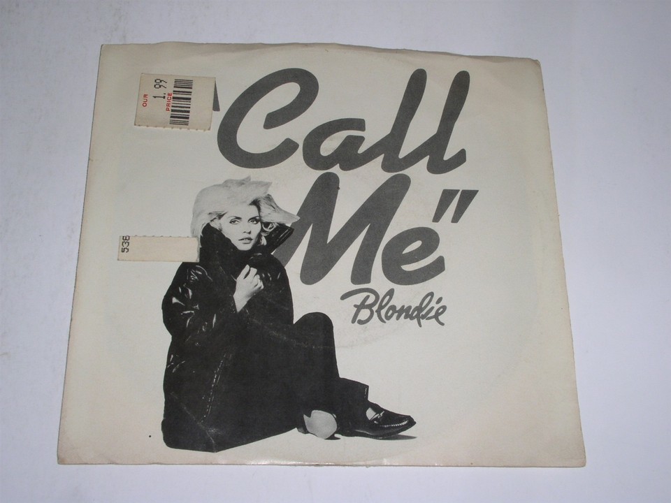 This is a vintage 45 rpm phonograph record by Blondie entitled, "Call Me". Flipside: "Instrumental". Record label Chrysalis CHS 2414. Comes with its original picture sleeve as shown.