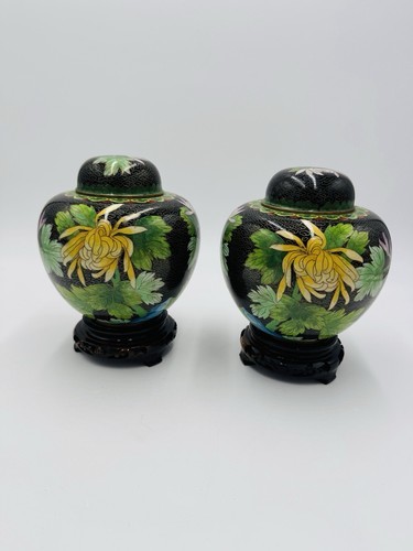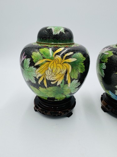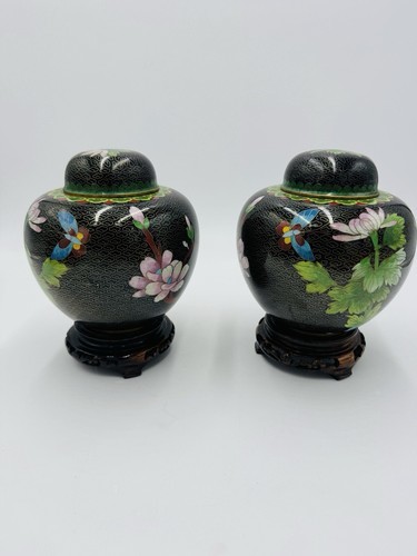 This vintage pair of ginger jar boasts a beautiful floral butterfly design, crafted from cloisonne brass and enameled in a variety of vibrant colors. The intricate inlay design is sure to catch the eye of any collector, and the jar's age of 1900-1940 adds to its historical significance. This piece originates from China and is a vintage original, making it a unique addition to any antique collection.