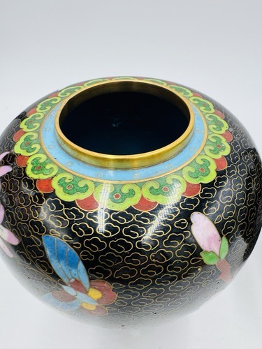 Vintage Cloisonne Brass Enameled Ginger Jar Floral Butterfly Inlay Design 7in