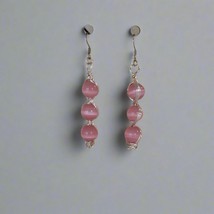 These handmade earrings feature three stacked pink Cat?s Eye beads wire-wrapped in a delicate silver-tone finish. Cat?s Eye beads are known for their luminous ?glow line? that shifts with the light, adding a subtle shimmer to your style. With their soft pink color and graceful 2" dangle, these earrings are perfect for everyday wear, gifts, or adding a feminine touch to your jewelry collection.