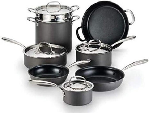 The Lagostina nera hard anodized 12 piece set includes hammered stainless steel lids and is inspired by generations of passionate Italian cooking. With cast riveted stainless steel handles, The pots and pans look stunning in the kitchen and on the table. The dual-layer, metal-utensil safe nonstick interior makes the cooking experience more enjoyable and the cleanup quick. The Hammered stainless steel lids add another beautiful feature and provide a tight seal to lock in flavor while simmering. Comfortable stay-cool handles are built for strength and stability over a lifetime of use. The cookware can withstand oven temperatures up to 500f, providing cooking versatility. These pots and pans are destined to be your go-to kitchen helpers. Covered by a lifetime .