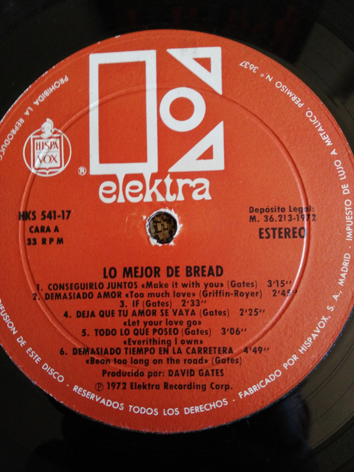 1.- BREAD: "The mejor de Breed" LP Elektra Hks 541-17 - 1972 Spanish EDITION G+