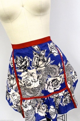 Pretty vintage 1950s apron, made with some vintage hankies. Bold blue and white with red grosgrain ribbon accents. 18? long, 11? wide at the waist, 26? wide at widest part. Excellent condition, all cotton.