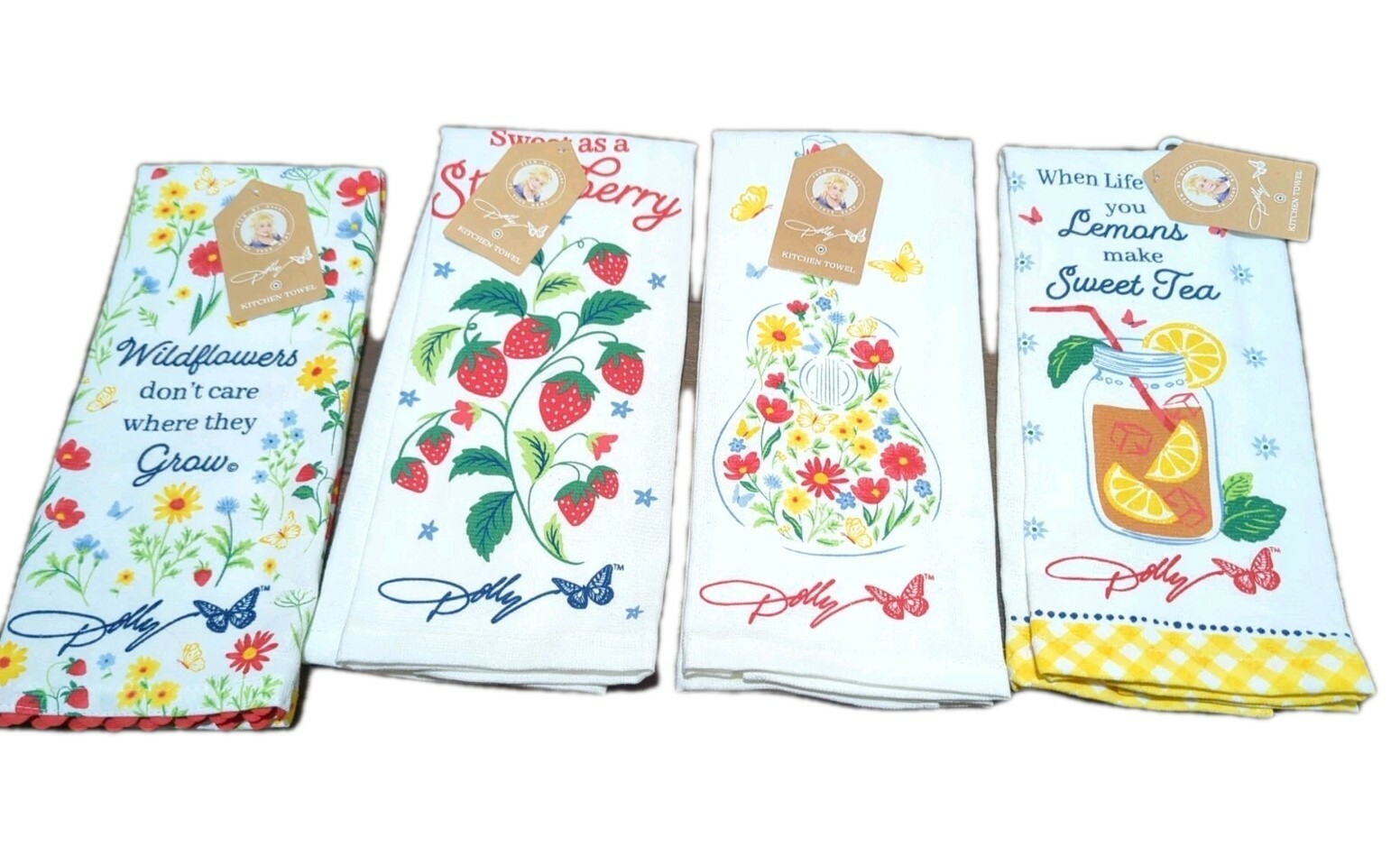 Lot 4x NEW Dolly Parton Kitchen Dish Towels WildFlowers Sweet Tea Strawberry