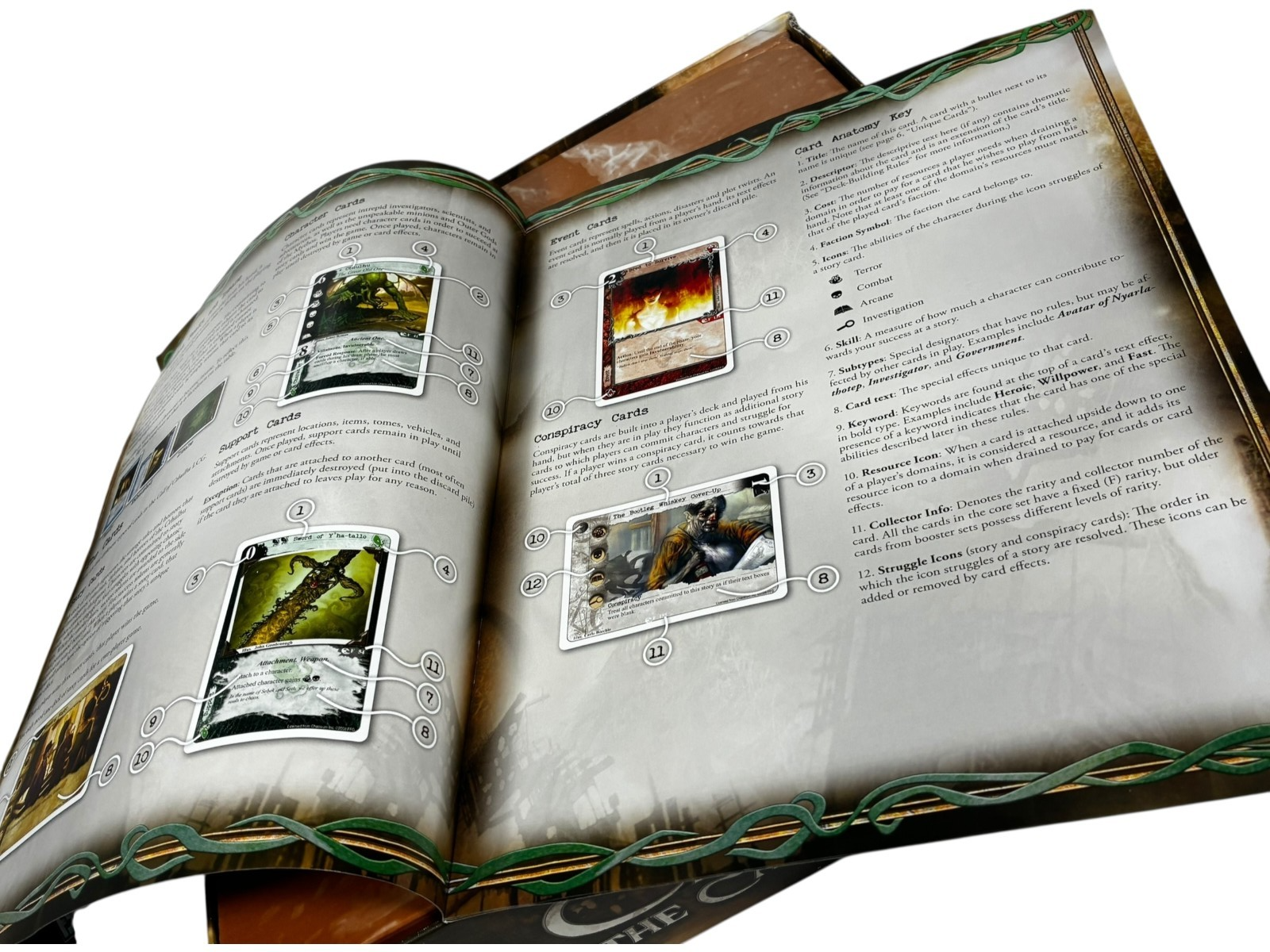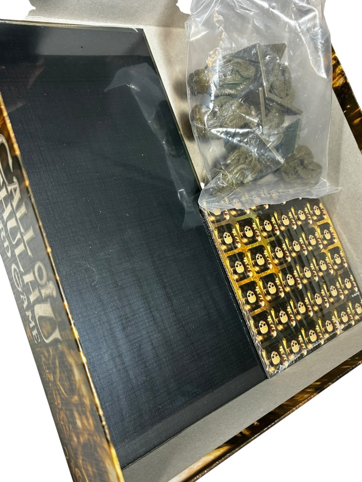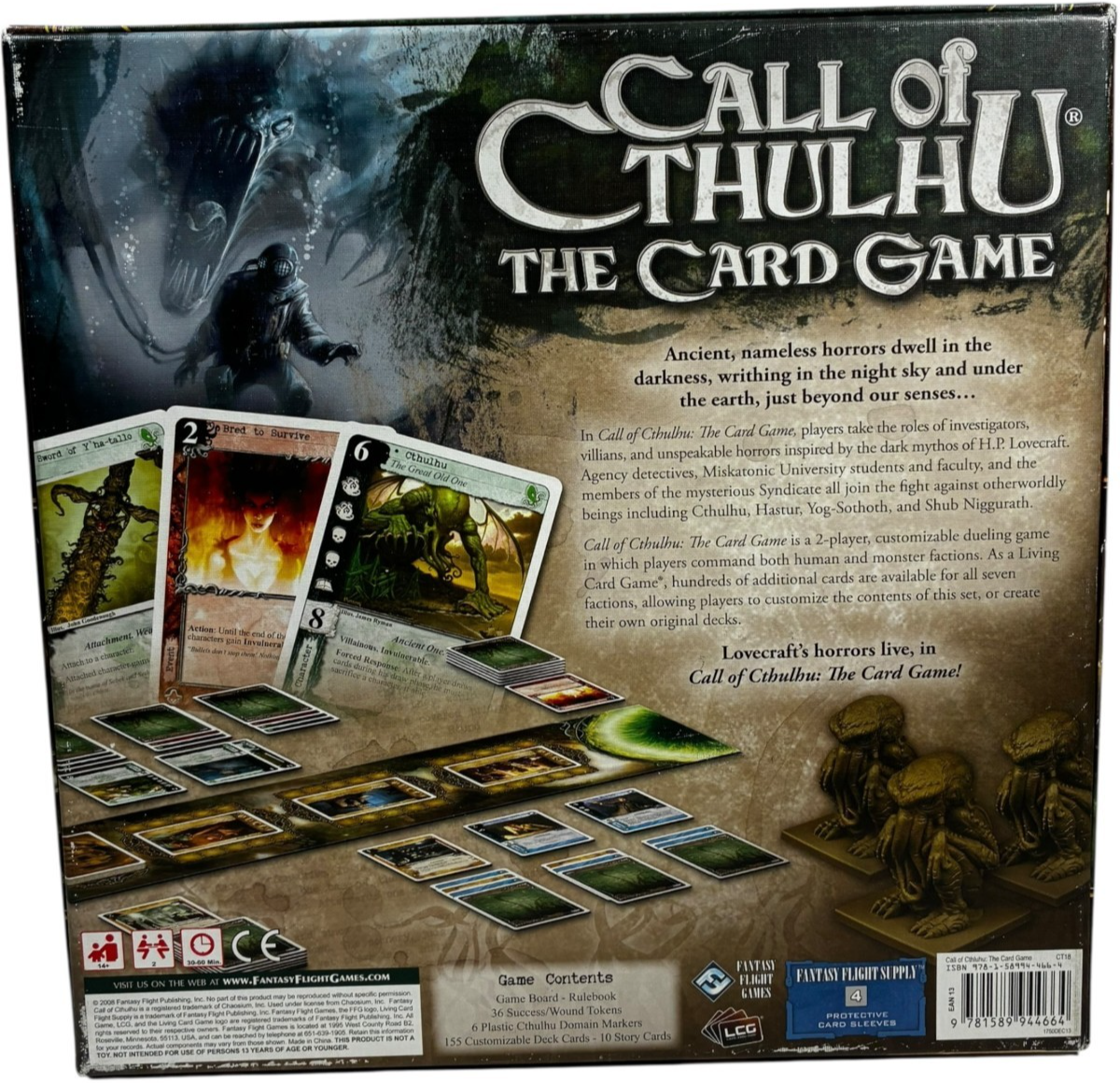 Lovecraft's horrors live, in Call of Cthulhu: The Card game!Game contents:Game Board, Rulebook,36 Success/Wound tokens,6 plastic Cthulhu domain markers,155 Customizable deck cards and 10 Story cards.