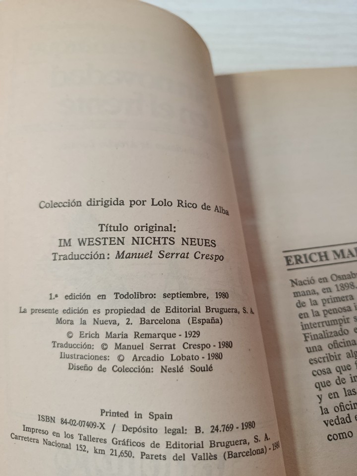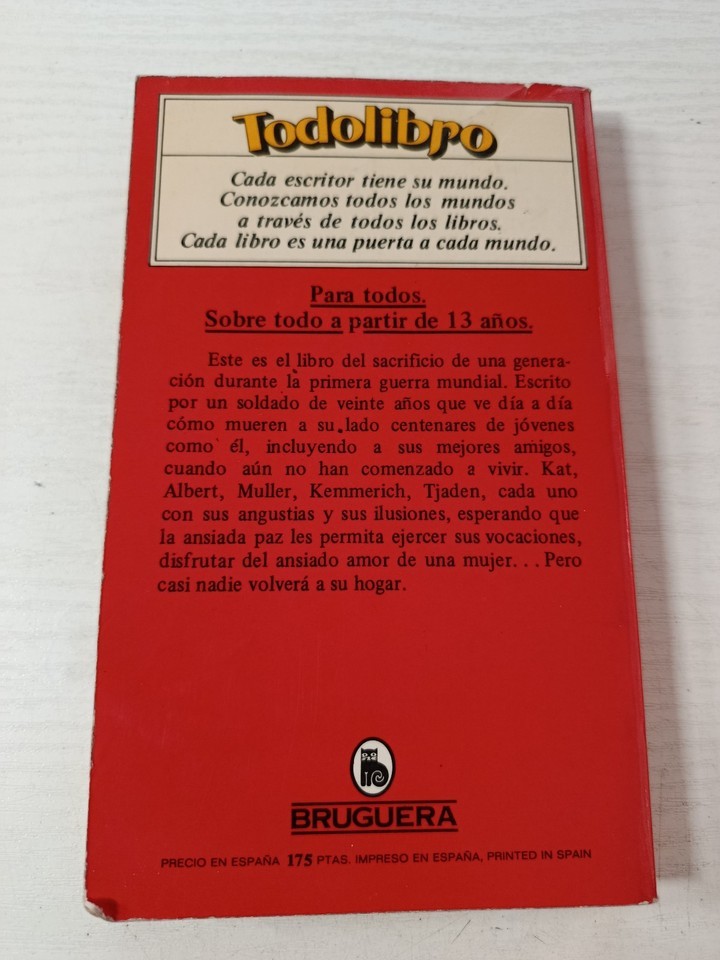 Sin nouveaute sur el front, Erich Maria Remarque, Bruguera 1980, roman anti-critique, d'abordGuerra Coupe du monde, litterature allemande, roman historique universel classique, tout calme sur le front occidental, livrede collection