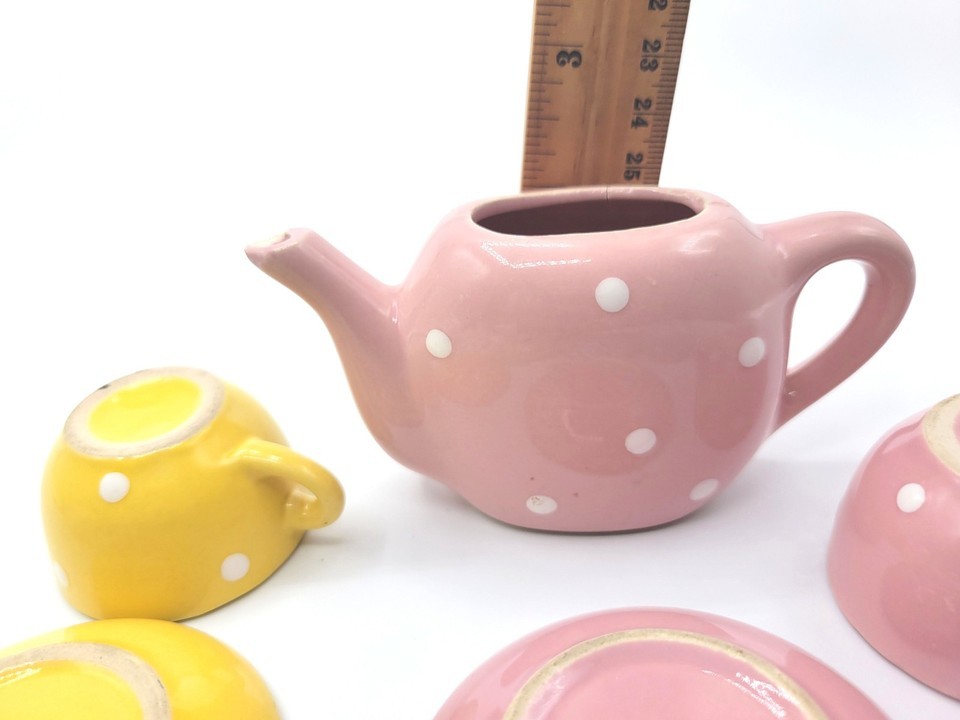 The tea sets feature a cute and playful design with tiny pokey-dots,