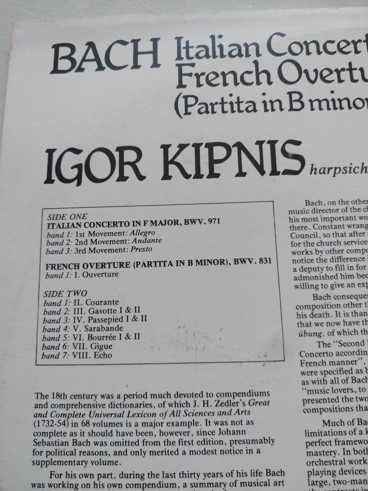 Bach Igor Kipnis plays Italian Concerto French Overture 1976 LP 12" Vinyl VG/VG