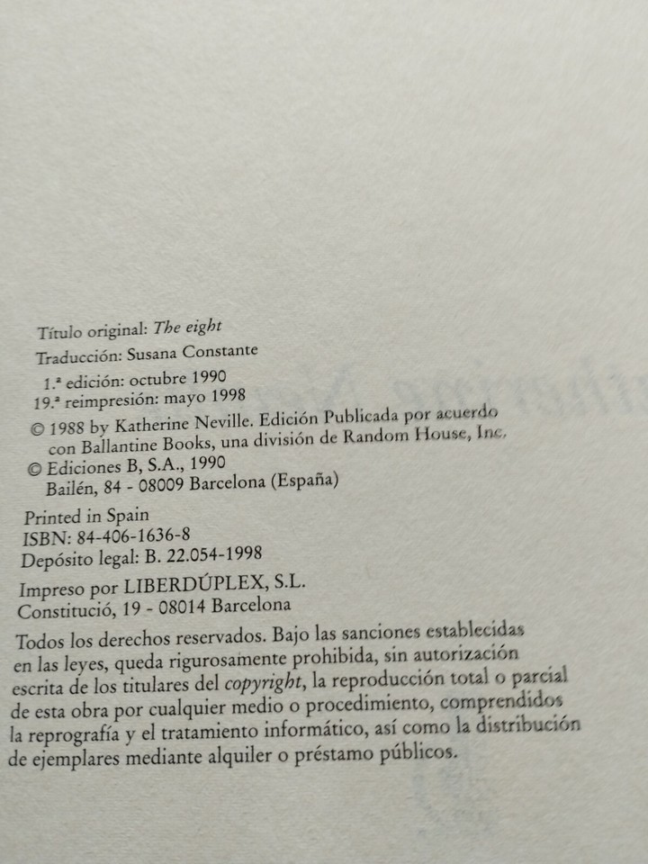 El Eight Katherine Neville 1998 Edition 20 Zeta - LIVRE Espagnol Am