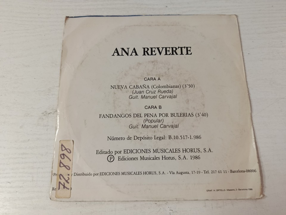 Edition espagnole originale del año 1986 publiee parel Horus Independent Stamp,dentrode Votre lignedeflamenco populaire. Ce single recueille dos chansons traditionnelles con des arrangements minutieux: face a un colombien moderne compose deJuanCruz Roue, et sur le visage bun Fandango par Buleríasde Racine traditionnelle. Met en evidence el accompagnement de la guitare en chargede Manuel Carvajal, collaborateur habituelde Ana Reverte a ce stade.