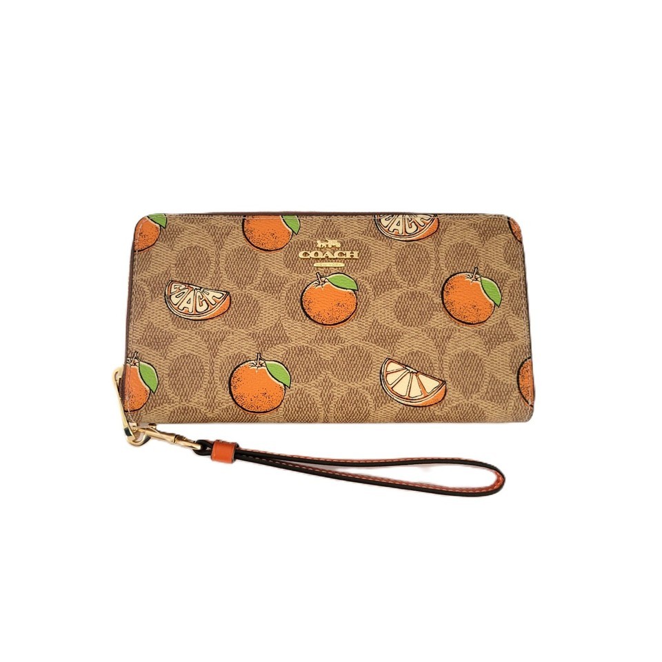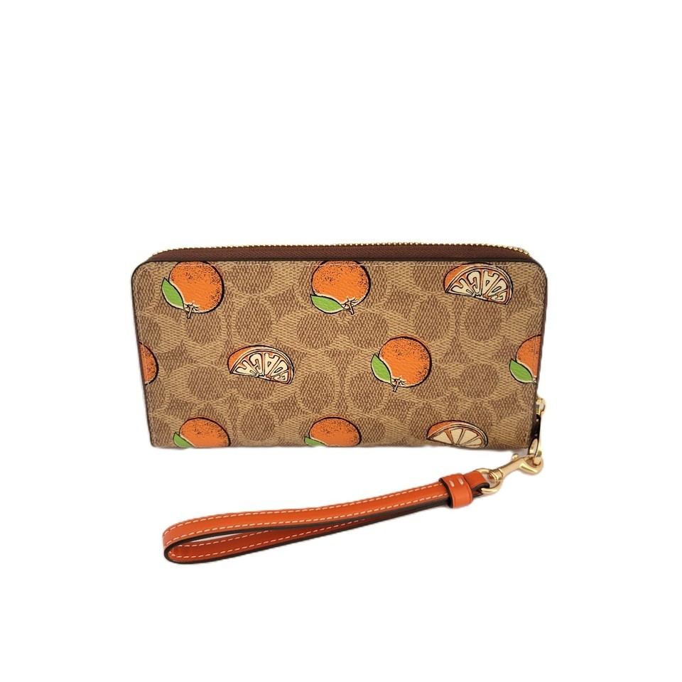 Coach CA092 Long Zip Around Wallet Signature Orange Print Tan Clutch Wristlet